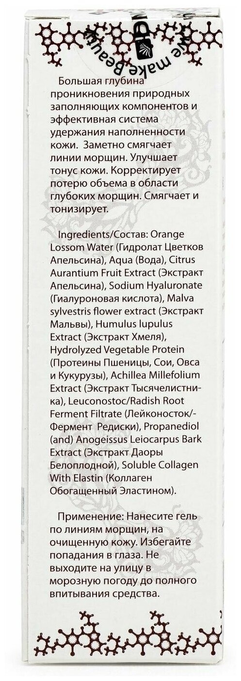 Тщательно подобранный специалистами комплекс дает большую глубину проникновения природных заполняющих компонентов и сохраняет наполненность кожи. Заметно смягчает линии морщин. Улучшает тонус кожи. Корректирует потерю объема в области глубоких морщин. Смягчает и тонизирует.