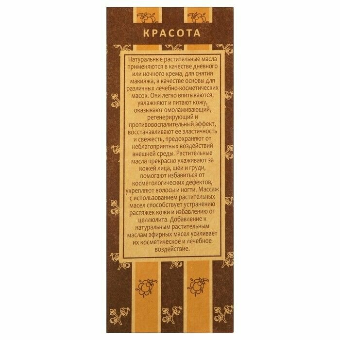 Растительное масло может использоваться в чистом виде, в смеси с другими растительными маслами или выступать в качестве основы для эфирных масел. Обогащение косметических средств На 10 мл (2 ч.л.) косметического средства или на 100 мл шампуня или бальзама – до 10 капель растительного масла. Маски для лица Нанести на лицо по массажным линиям. Время процедуры – 15-20 минут. Очищение кожи лица Ватный диск смочить горячей водой, отжать, нанести на него жирное масло, протереть кожу ватным диском по массажным линиям. Массаж лица и тела Масло используется для непосредственного массирования тела, в том числе лица, шеи и области декольте. Пропорция обогащения базового масла эфирным маслом: 5 мл (1 чайная ложка) базового масла – 3-5 капель эфирного масла 30 мл базового масла – 12-30 капель эфирного масла 50 мл базового масла – 30-50 капель эфирного масла