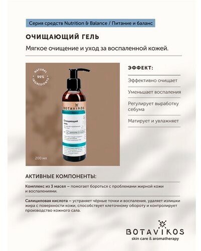 Гель для жирной и проблемной кожи на основе растительных компонентов качественно очищает кожу, не нарушая PH баланс, обладает противовоспалительным и антисептическим действием. Уникальное сочетание активных компонентов в составе позволяет значительно улучшить цвет лица и текстуру кожи. Гель удаляет загрязнения с жирной кожи. При регулярном использовании избавляет от черных точек.