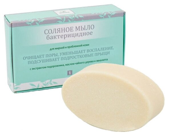 Омыленная смесь кокосового, пальмового, касторового масел и масла карите, природная каменная соль озера Баскунчак, вода, каолин, экстракт подорожника, природный глицерин, экстракт тысячелистника, экстракт хвоща,эфирное масло шалфея, эфирное масло розмарина, эфирное масло эвкалипта, эфирное масло чайного дерева, эфирное масло бергамота, витамин Е.