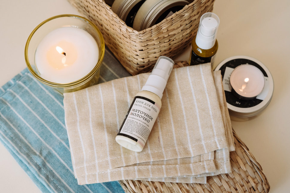 Оливковое масло, гель алое-вера, талая родниковая вода, полавакс (эмульсионный воск), мед, маточное молочко, молочная кислота, бетаин, эфирное масло иланг - иланг, растительный консервант (цитрат серебра), витамин, Е,А.