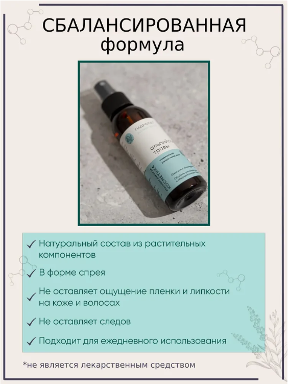 Гидролат Альпийские травы (цветочная вода) – продукт паровой дистилляции (выпаривания) чабреца, донника, репешка, зверобоя, мелиссы, душицы. Собранный конденсат пара - это целебная жидкость, которая содержит водорастворимые полезные компоненты растения. Для ухода за нормальной, комбинированной, жирной кожей.