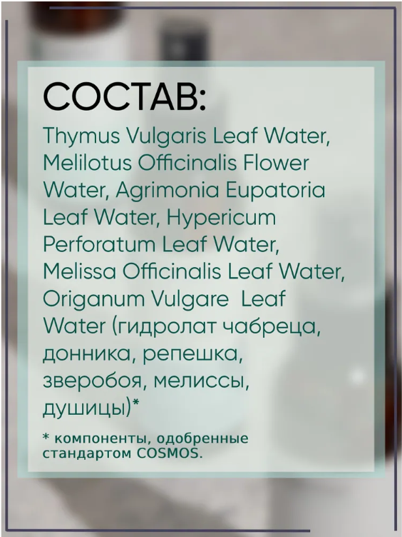 Состав | продукт паровой дистилляции (выпаривания) чабреца, донника, репешка, зверобоя, мелиссы, душицы |