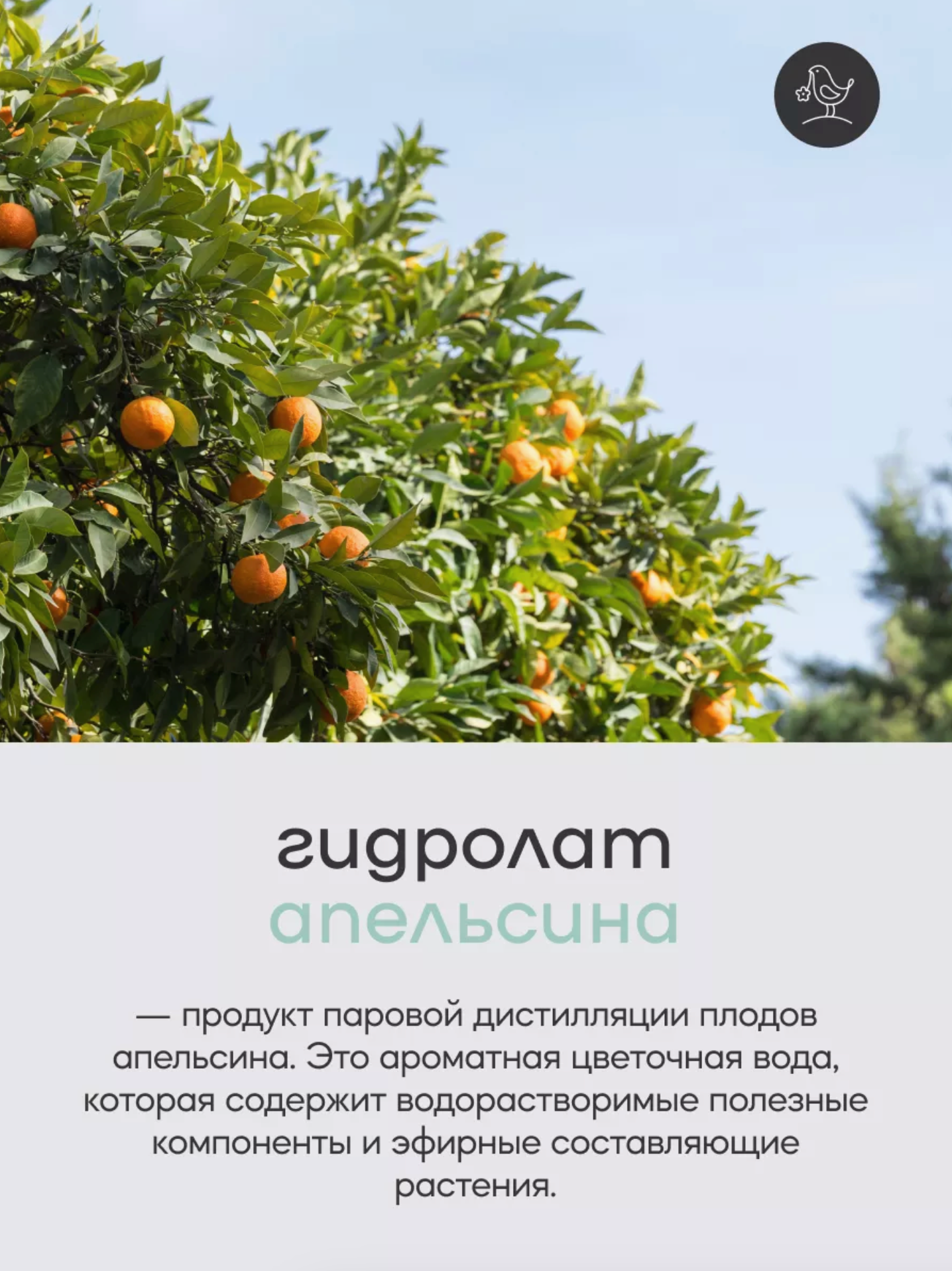 Гидролат Апельсина (цветочная вода) –продукт паровой дистилляции (выпаривания) плодов апельсина. Собранный конденсат пара - это целебная жидкость, которая содержит водорастворимые полезные компоненты растения. Подходит для сухой, чувствительной, нормальной и зрелой кожи.