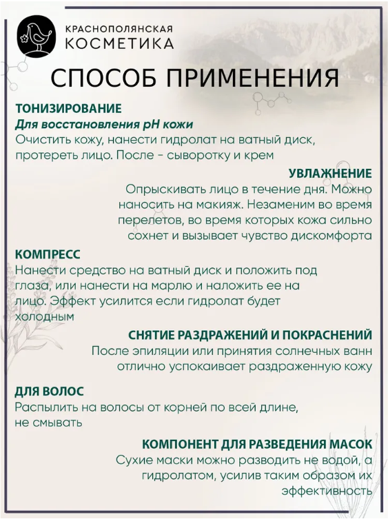 Распылить гидролат на кожу или нанести на ватный диск и протереть им кожу.Также можно распылить необходимое количество гидролата по всей длине волос.
