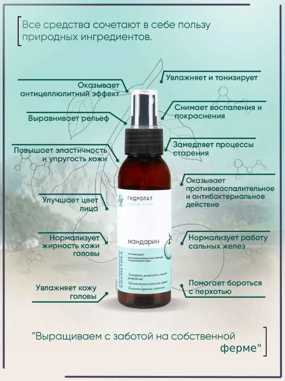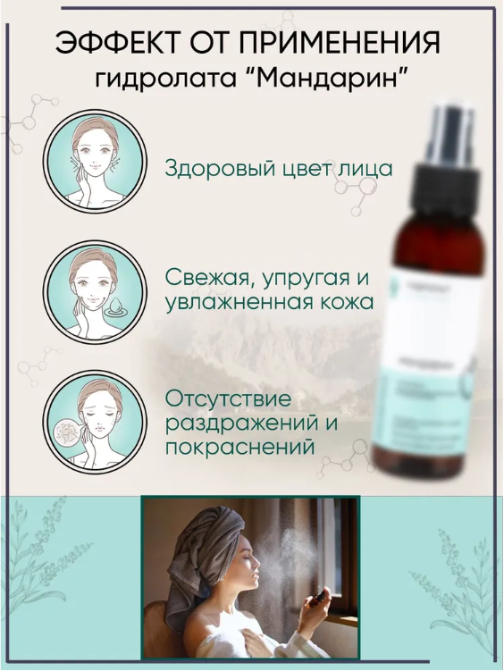 Гидролат Мандарина (цветочная вода) –продукт паровой дистилляции (выпаривания) плодов мандарина. Собранный конденсат пара - это целебная жидкость, которая содержит водорастворимые полезные компоненты растения. Подходит для ухода за комбинированной кожей, жирной кожей, склонной к появлению акне и угревой сыпи.