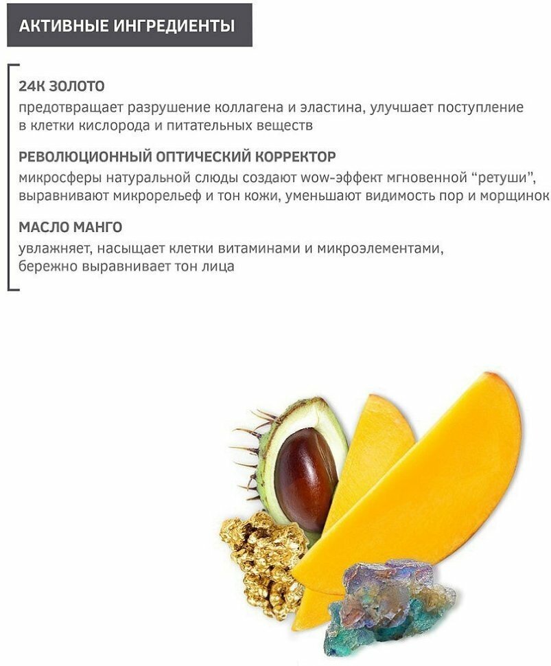 Aqua, Niacinamide (витамин В3), Cetearyl Olivate, Sorbitan Olivate, Glycerin (растительный глицерин), Hydroxyethyl Urea, Silica, Opuntia Ficus Indica Stem Extract (экстракт кактуса опунции), Cetyl Alcohol, Cetearyl Alcohol, Dicaprylyl Ether, Butyrospermum Parkii Butter (масло ши), Mangifera Indica Seed Butter (масло манго), Hydrolyzed Vegetable Protein (биополимер на основе растительных протеинов), Ethylhexylglycerin, Benzyl Alcohol, Corylus Avellana Seed Oil (масло лесного ореха), Persea Gratissima Oil (масло авокадо), Saccharide Isomerate*, Citric Acid*, Sodium Citrate*, Colloidal Gold (коллоидное золото), Triticum Vulgare Germ Oil (масло зародышей пшеницы), Rosmarinus Officinalis Leaf Extract (экстракт розмарина), Succinic Acid (янтарная кислота), Tetrasodium Glutamate Diacetate, Tocopherol (витамин Е), Parfum. *Комплекс растительных углеводов, идентичных коже