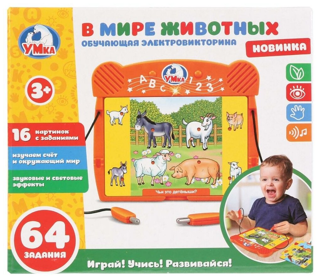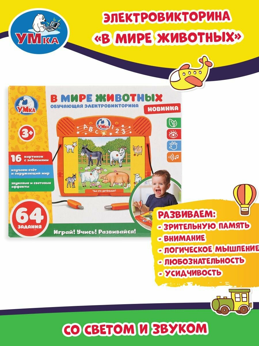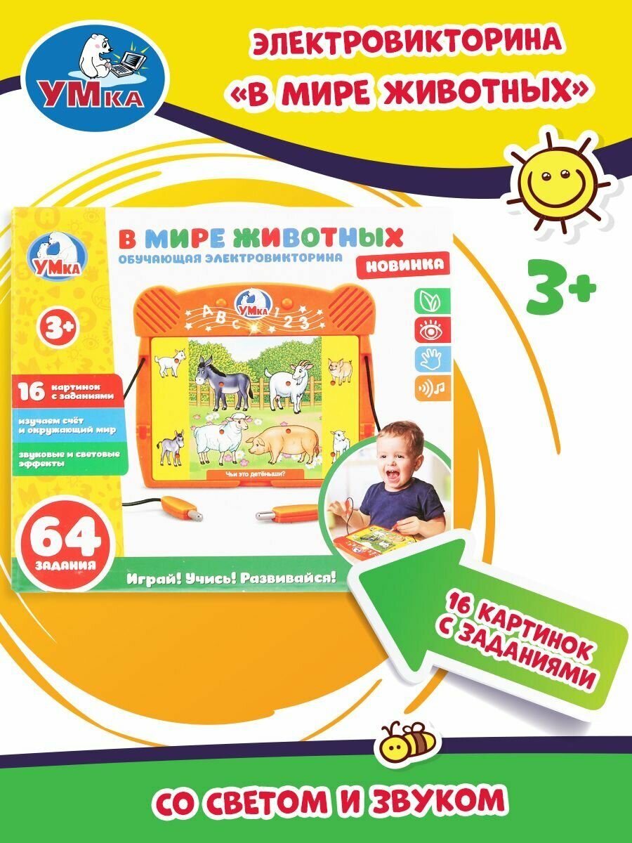 Умка Развивающая игрушка Обучающая электровикторина Дети обожают игры – и особенно интересно и весело им будет играть с такой чудесной викториной! Пора проверить и укрепить ваши знания о животных. Знаете ли вы всех-всех зверей? Выучим! А что вам известно о детёнышах домашних животных? После этой умной и весёлой игры – будет известно всё-всё! Задача ребёнка – соединить верно парочки, и получить верный ответ, при правильном ответе загорается специальная лампочка-индикатор. Вместе с ребёнком изучайте окружающий мир в самой эффективной – весёлой игровой форме! Развивающая игрушка Обучающая электровикторина. В мире животных – сразу 7 в 1: Слушаем: со звуковыми эффектами! Смотрим: яркие цвета, добрые изображения-картинки и световые эффекты! Изучаем счёт! Учим: животных и расширяем кругозор! Развиваем моторику, мышление, внимание и память Играем: выполняем 64 увлекательных задания 16 Картинок с заданиями Размеры игрушки: 15х12х2 см Материал: пластмасса + металл Работает от 2-х бат. АА Для детей от 3-х лет