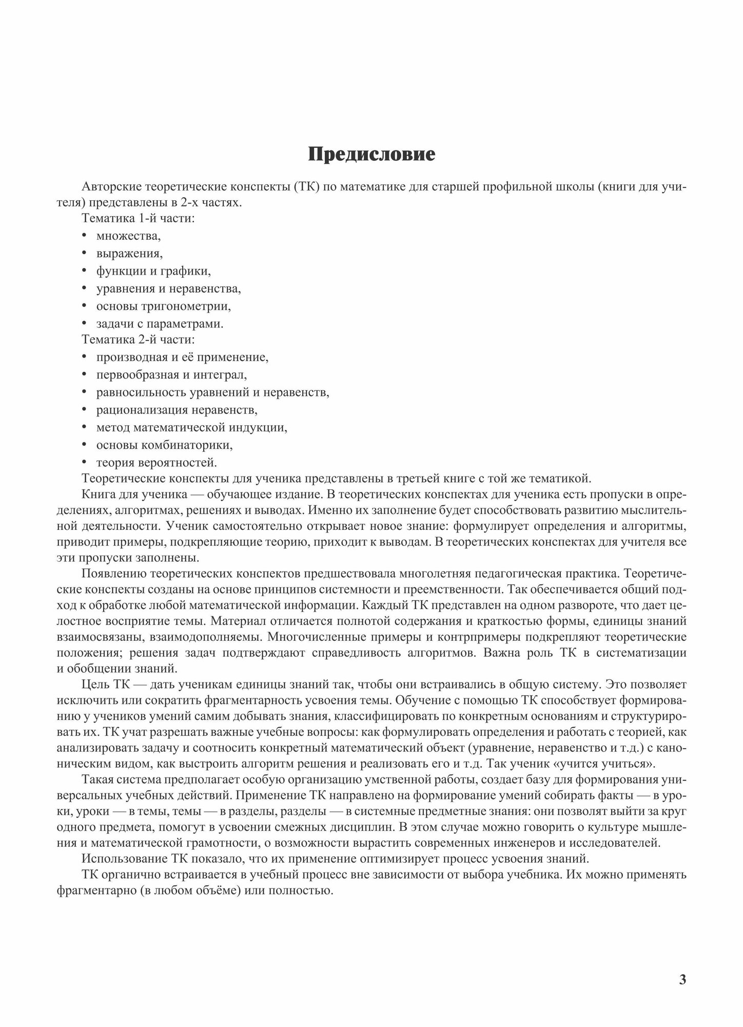 В книге представлены в форме конспектов теоретические материалы по темам курса профильной математики 10-11. Каждый конспект сопровождается методическими материалами, включающими понятийный аппарат, рекомендации по использованию, ответы на ключевые вопросы темы, практические задания и решения сложных задач. Конспекты созданы на основе многолетней практики преподавания математики в старшей школе. Основная цель конспектов - получение системных знаний, формирование логического мышления, снятие затруднений в усвоении сложных вопросов, выравнивание уровней обученности учеников, подтягивание отстающих. Это дает возможность подготовить в будущем современного инженера и исследователя. В целом конспекты учат учиться.