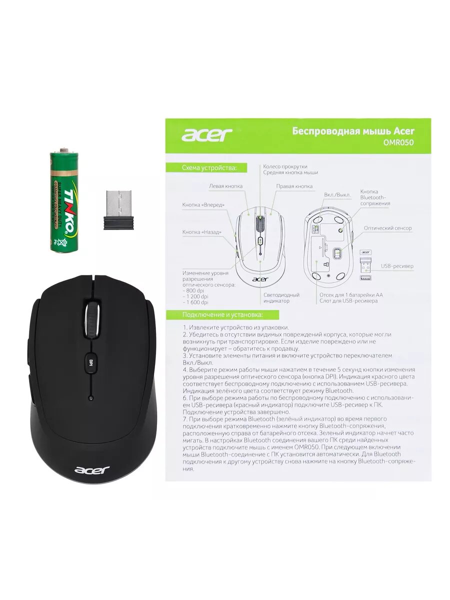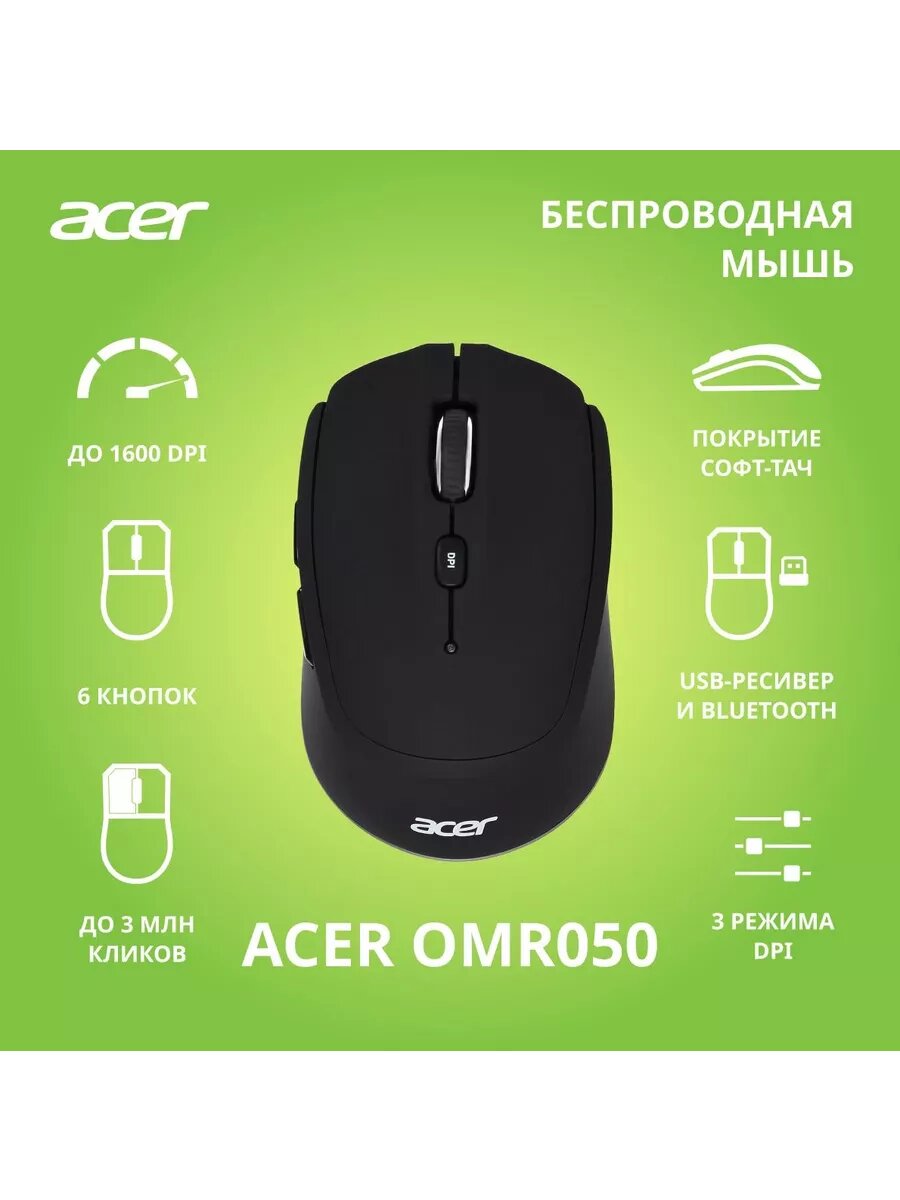 Мышь Acer OMR050 сочетает в себе удобство беспроводного подключения и комфорт при длительной работе. Встроенный чип обеспечивает большую дистанцию и более стабильное соединение. Мышь имеет асимметричную форму, подходит для правшей.