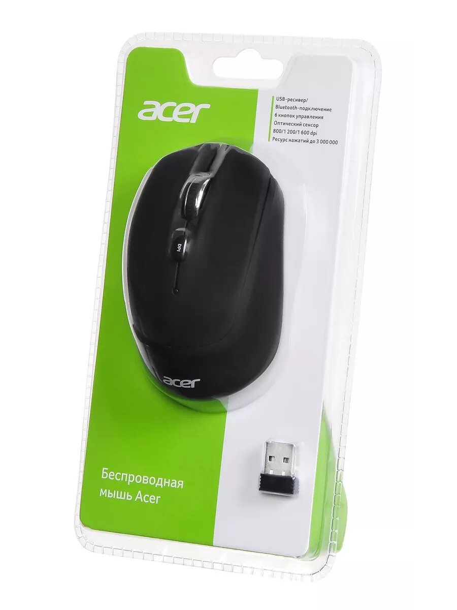 Мышь Acer сочетает в себе удобство беспроводного подключения и комфорт при длительной работе. Встроенный чип обеспечивает большую дистанцию и более стабильное соединение. Мышь имеет симметричную форму, подходит как для правшей, так и для левшей.