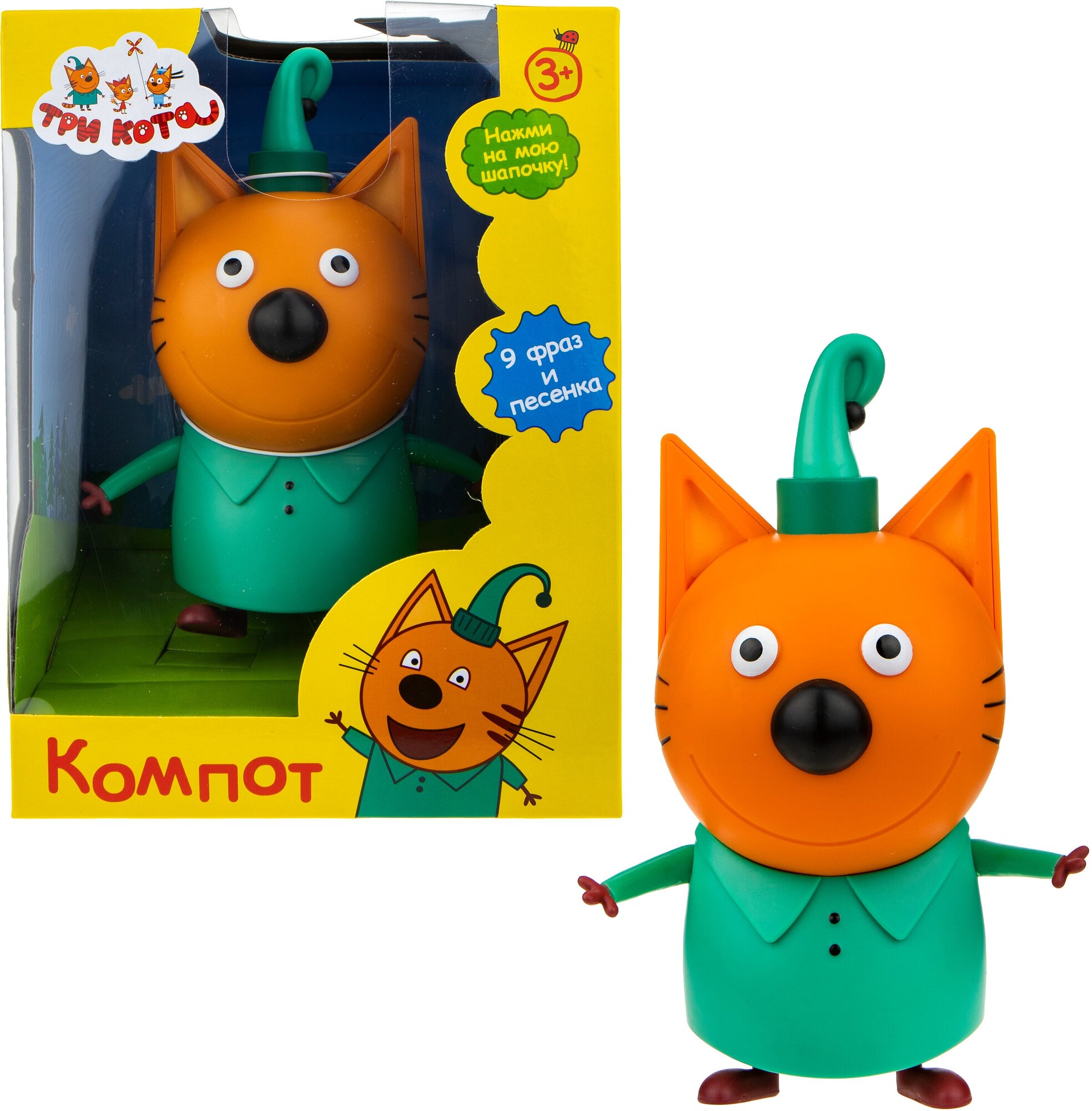 Он говорит всего 9 самых популярных фраз, а также проигрывает любимую всеми детьми песенку и знаменитое Миу-Миу-Миу! для воспроизведения каждой фразы достаточно нажать на шапочку на голове Компота. Батарейки заменяемые, игрушка активируется, если выдернуть защитный шнур на задней части фигурки.