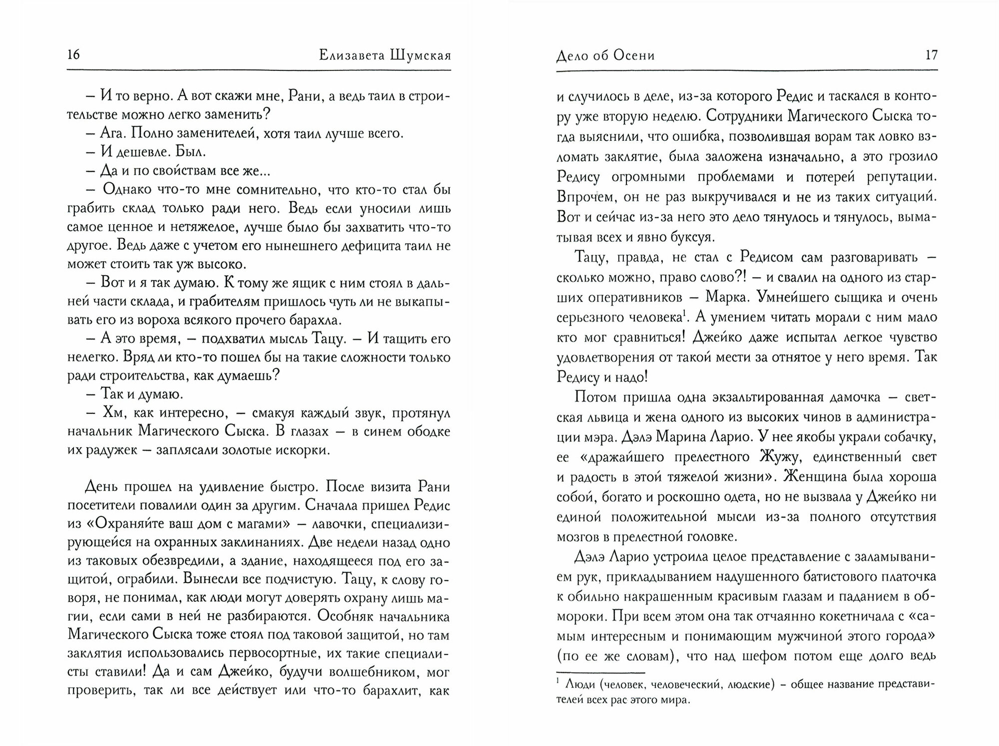 Вторая часть цикла "Семейка" - "Дело об Осени" (переиздание), на мой взгляд, более увлекательная и логически выстроенная, чем первая. Сюжет неспешен, но постепенно автор раскручивает увлекательнейшую интригу. Само описание осеннего города словно погружает в какую-то волшебную атмосферу: "Музыка осени всегда чуточку печальна. В ней поют листья об ушедшем лете. Рассказывают о долгом пути птицы. И ветер шепчет о приближающихся холодах. И вместе с тем эта музыка о том, что зрелость - роскошна, прекрасна и щедра". Ну а в центре событий, как и в первой книге, - харизматичный начальник Магического сыска Джейко Тацу. В его любимый город приезжает не только неуловимый вор Акицунэ (никто не знает даже - мужчина это или женщина), но и некоторые высокопоставленные люди. И после бала у мэра города они все встретятся на странном аукционе, на котором будет выставлен крайне необычный артефакт. Ну а дальше будут убийства, интриги и даже элементарные подставы. Каждый желающий обладать артефактом раскроется с очень неприятной стороны. Поэтому у Джейко и его команды будет много дел. Детективная составляющая в этом романе более выраженная и логически выстроенная, чем в первом. Да и персонажи более интересны. Даже главный герой в этой книге повзрослевший, думающий и интересно рассуждающий человек. Например, о власти: "Как можно верить, что власть - это некая вещь, которую можно заполучить в вечное владение? Власть - это процесс. Даже если ты забрался на самую верхушку, надо постоянно следить за тем, чтобы все это не превратилось в иллюзию. А это работа, и работа непростая. Все видеть, все замечать, все понимать, не оставлять за спиной врагов, распознавать конкурентов". Слэша в этой книге почти нет, что неимоверно радует. Но и в целом книга произвела сильное впечатление.