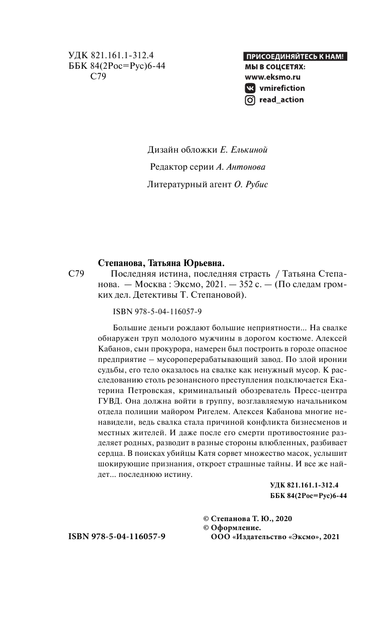 Большие деньги рождают большие неприятности… На свалке обнаружен труп молодого мужчины в дорогом костюме. Алексей Кабанов, сын прокурора, намерен был построить в городе опасное предприятие – мусороперерабатывающий завод. По злой иронии судьбы, его тело оказалось на свалке как ненужный мусор. К расследованию столь резонансного преступления подключается Екатерина Петровская, криминальный обозреватель Пресс-Центра ГУВД. Она должна войти в группу, возглавляемую начальником отдела полиции майором Ригелем. Алексея Кабанова многие ненавидели, ведь свалка стала причиной конфликта бизнесменов и местных жителей. И даже после его смерти противостояние разделяет родных, разводит в разные стороны влюбленных, разбивает сердца. В поисках убийцы Катя сорвет множество масок, услышит шокирующие признания, откроет страшные тайны. И все же найдет… последнюю истину.