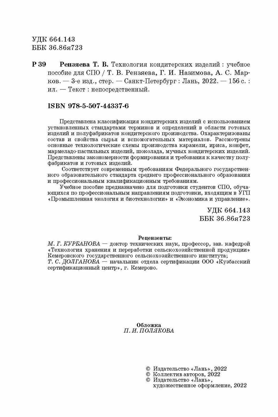 Технология кондитерских изделий. Учебное пособие. СПО (Рензяева Тамара Владимировна, Назимова Галина Ивановна, Марков Александр Сергеевич); Лань, 2022