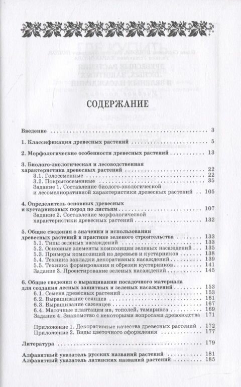 Приводится классификация и описание древесных растений, таблица определения деревьев и кустарников по листьям, сведения о возможностях использования древесных растений в практике зеленого строительства, данные по древоводству: лесные плоды и семена, выращивание сеянцев и саженцев, получение черенков. Предложены задания для самостоятельной работы студентов.