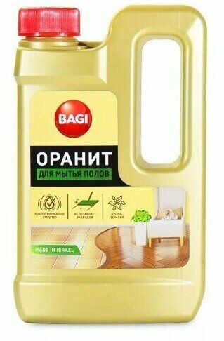 | Способ применения | На 6-10 л воды добавить пол стакана (60 мл) средства и вымыть пол. Для особо загрязненного пола повторить действие или увеличить концентрацию Оранита до 100 мл. |