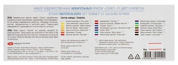 Художественные акварельные краски «Сонет» разработаны для начинающих художников, открывающих или совершенствующих свои творческие способности. Изготавливаются по современным рецептурам на основе преимущественно органических пигментов и синтетического связующего. Обладают интенсивностью цвета и прозрачностью. Превосходно смешиваются, размываются и легко берутся на кисть. Сбалансированная палитра из 21 цвета в эргономичном металлическом пенале «Сонет» позволяет решить множество творческих задач начинающего художника.