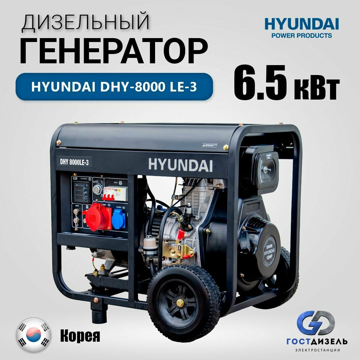 Дизельный генератор HYUNDAI 380/220/12 В 6.5кВт DHY 8000LE-3