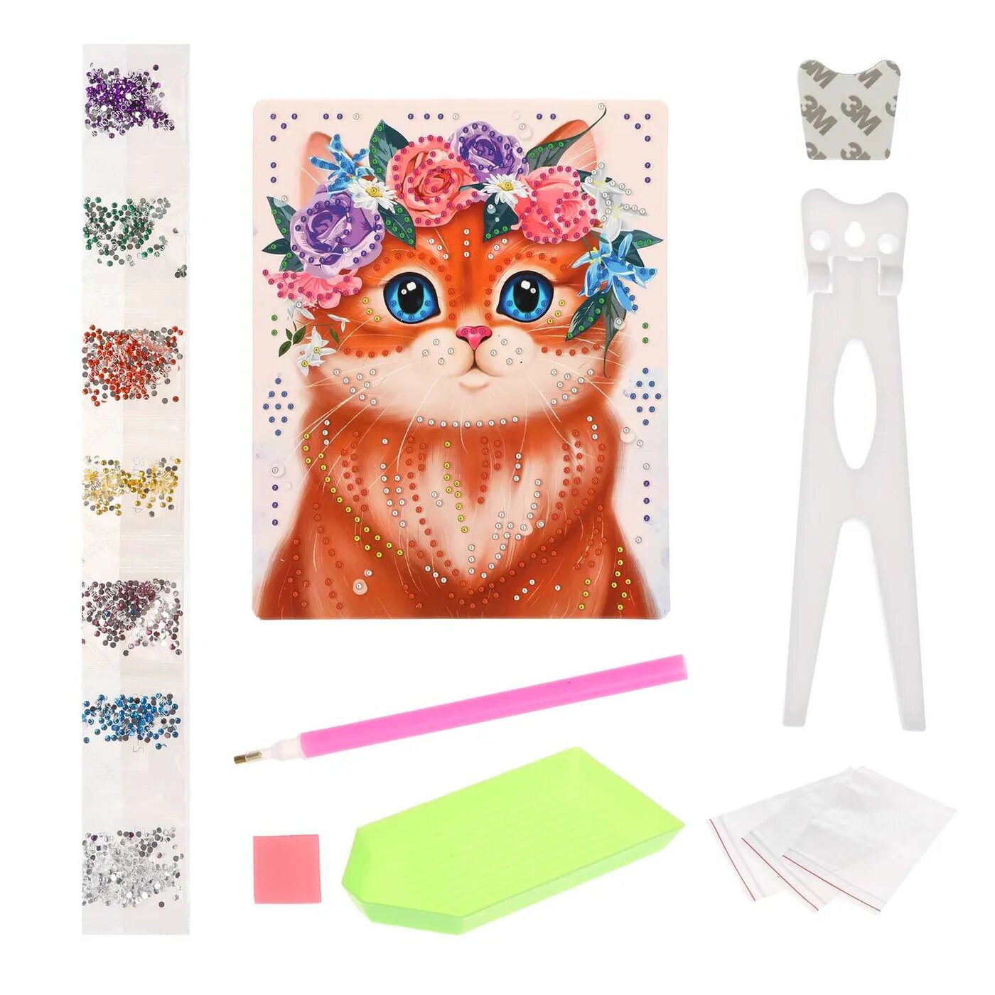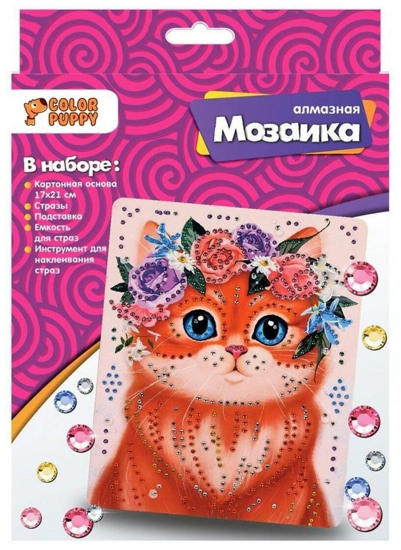 | Состав набора | картонная основа 17х21 см, стразы, подставка, емкость для страз, инструмент для наклеивания страз |