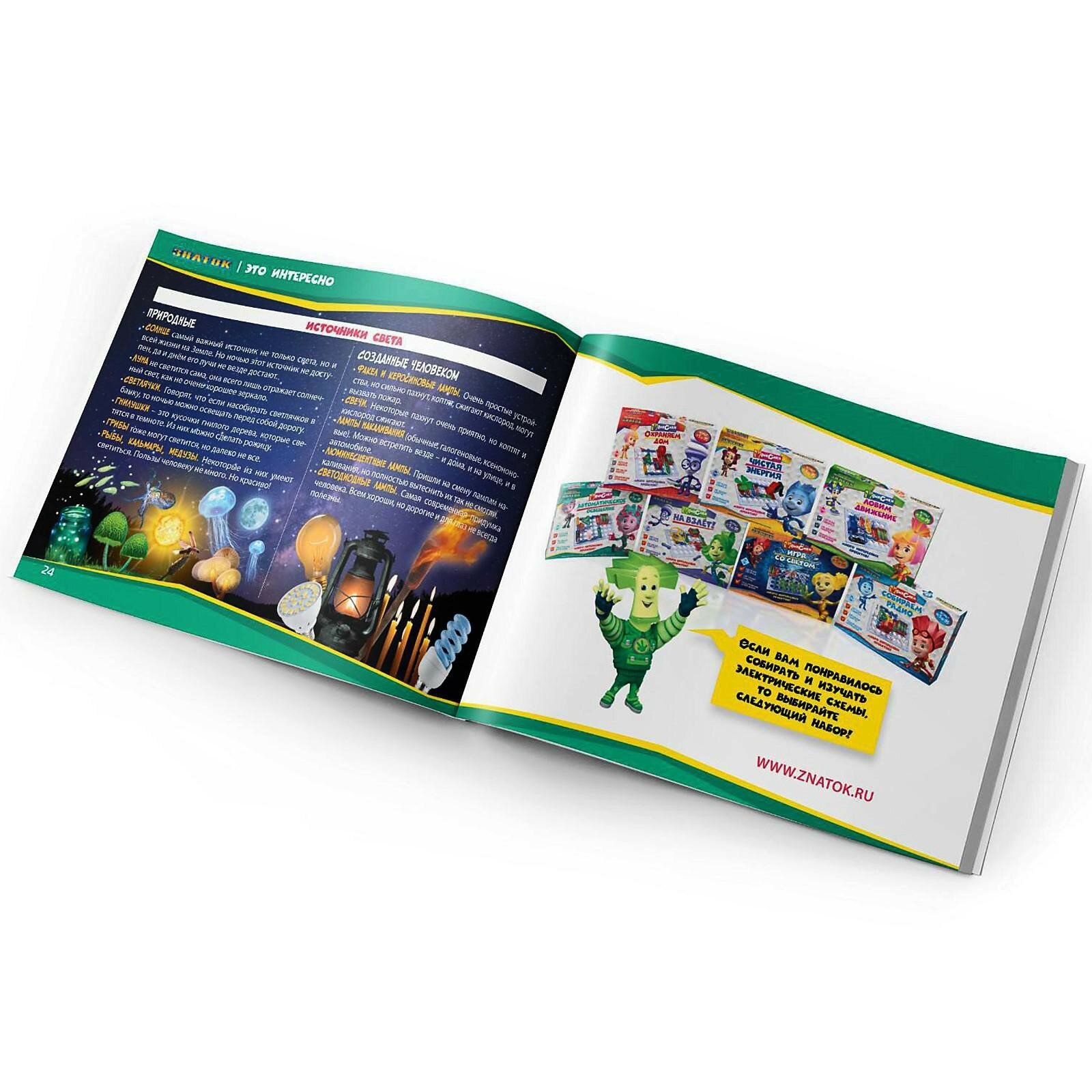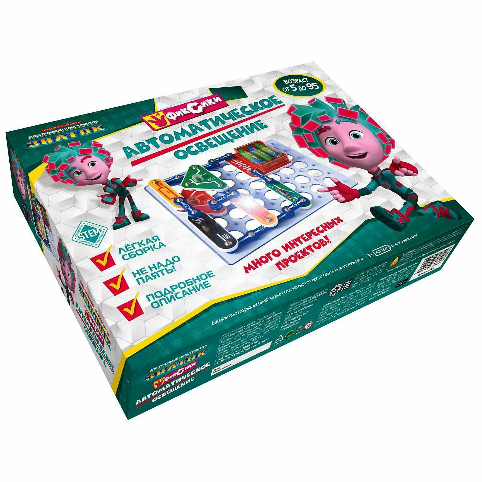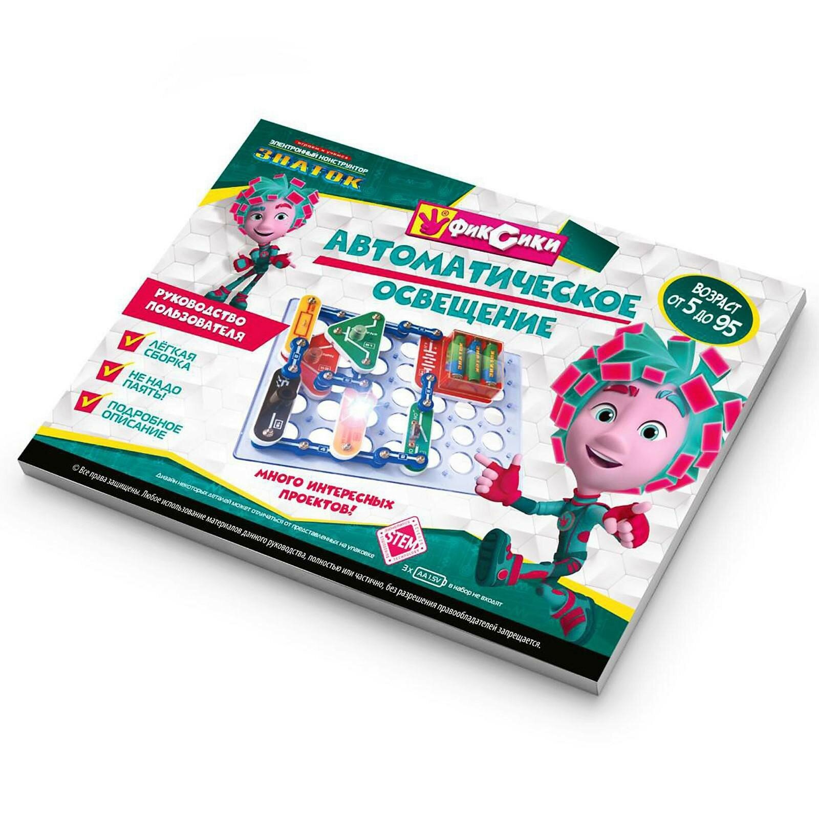 Электронный конструктор начального уровня, позволяющий ребёнку понять, как работают многие «умные вещи» вокруг нас, в частности, системы автоматического освещения, которые экономят электроэнергию и, следовательно, деньги. Даже без помощи взрослых, используя очень понятное цветное руководство, всего за несколько минут, он или она смогут собрать и испытать схему с практически 100% положительным результатом. Очень полезна будет подсказка в виде QR-кода, которую можно просмотреть при помощи смартфона или планшета.Абсолютная безопасность и простота сборки — не надо паять!Мы рекомендуем данный конструктор для детей 5-10 лет, но он рассчитан практически на любой возраст. Простота соединений и ясность описания позволяет собирать сложные схемы даже ребенку пяти лет, но даже умудренному в электронике человеку будет интересно собрать и опробовать схему, а затем воплотить её в реальной жизни.Удовольствие получают не только дети, но и их родители!Помимо этого в «Руководстве пользователя» вы найдёте перечень элементов конструктора. Для удобства собирания деталей в коробку мы приводим схему расположения элементов.В комплектацию данного набора входит «Руководство пользователя» и детали, необходимые для выполнения предложенных в руководстве проектов. Руководство с описанием схем располагается в коробке под прозрачной монтажной платой. Нижняя часть коробки вместе с деталями и книгой запечатана в полиэтиленовую плёнку.Для работы схем необходимы 3 батареи (приобретаются отдельно) размера АА, напряжением 1,5 V.