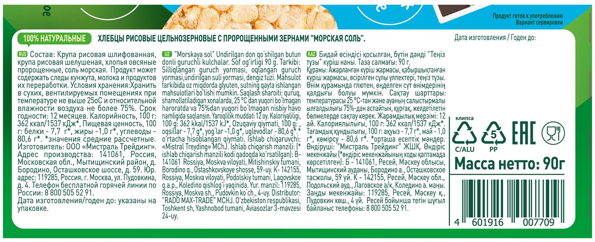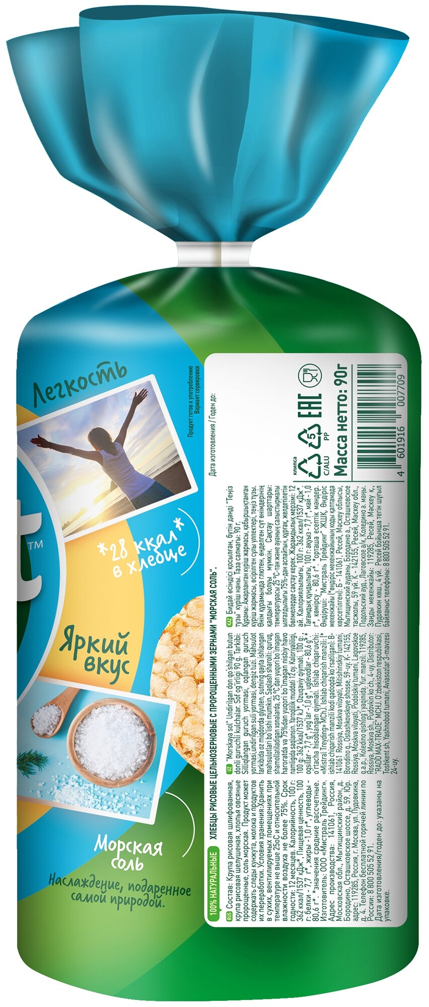 Цельнозерновой рис и клетчатка для здорового пищеварения и чувства сытости надолго. Идеальный перекус в офисе, дома и в дороге. Натуральный вкус - морская соль. Пророщенные зерна. Живой микс питательных веществ и антиоксидантов для красоты и молодости.