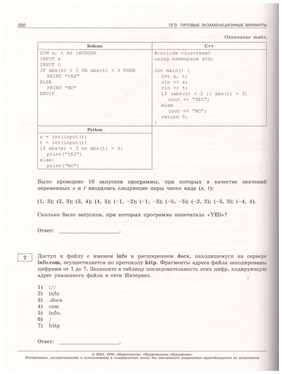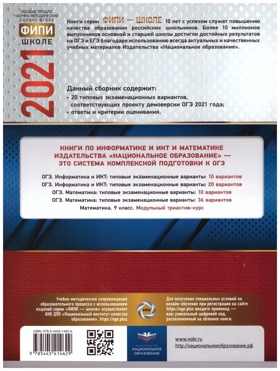 • 20 типовых экзаменационных вариантов, составленных в соответствии с проектом демоверсии КИМ ОГЭ по информатике и ИКТ 2021 года;