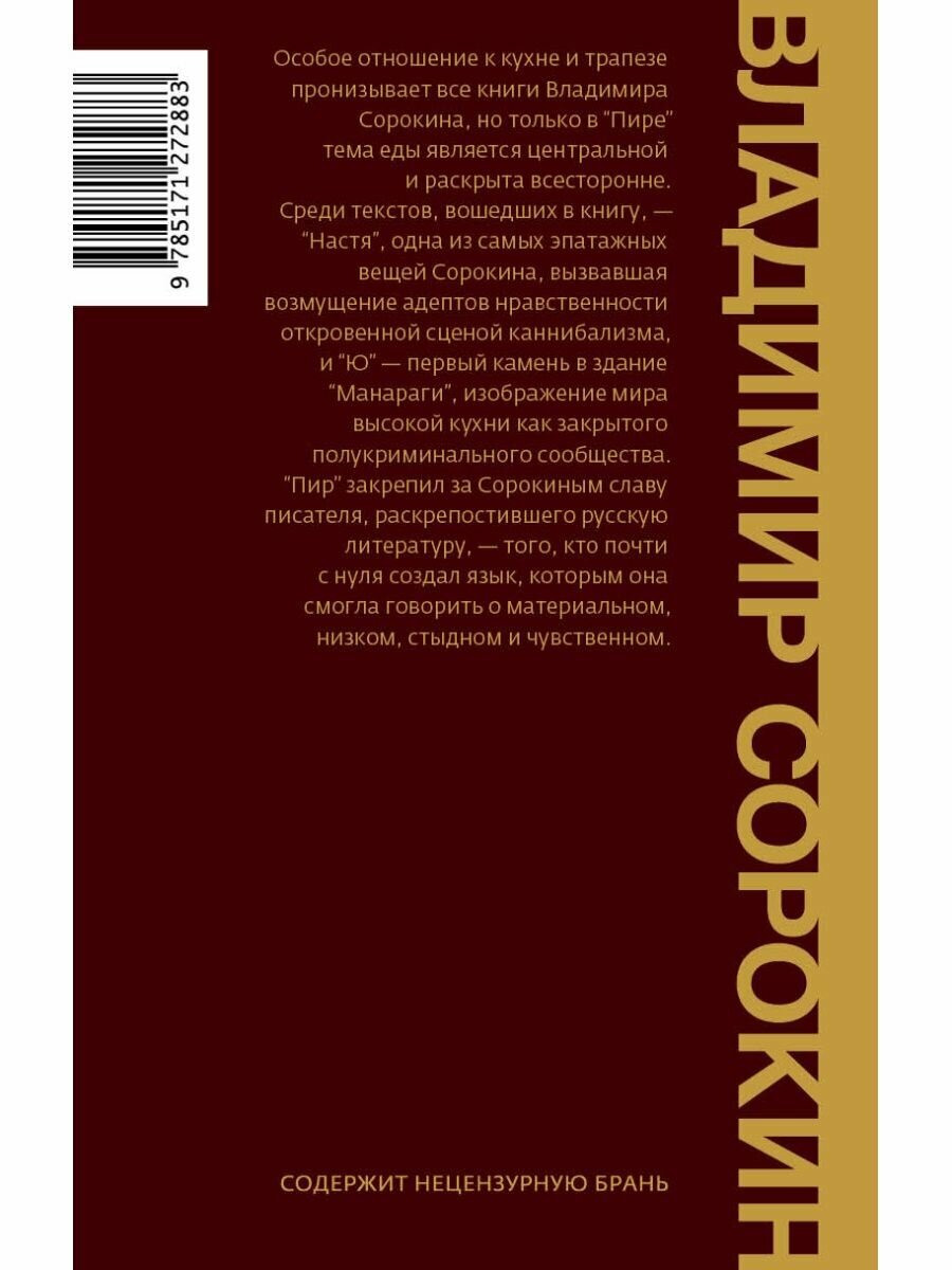 Особое отношение к кухне и трапезе пронизывает все книги Владимира Сорокина, но только в “Пире” тема еды является центральной и раскрыта всесторонне. Овеществление метафоры — излюбленный авторский прием — как нельзя лучше походит для исследования культурного и символического смысла голода и насыщения. Сквозь призму еды автор разглядывает человеческие отношения и страсти, классические произведения и традиционные стили русской литературы, прошедшую историю и утопическое будущее.