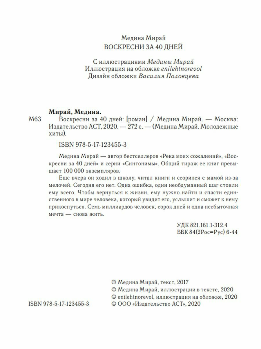Медина Мирай - автор бестселлеров "Река моих сожалений", "Воскресни за 40 дней" и серии "Синтонимы". Общий тираж ее книг превышает 100 000 экземпляров. Еще вчера он ходил в школу, читал книги и ссорился с мамой из-за мелочей. Сегодня его нет. Одна ошибка, один необдуманный шаг стоили ему всего. Чтобы вернуться к жизни, ему нужно найти и спасти единственного в мире человека, который увидит его, услышит и сможет к нему прикоснуться. Семь миллиардов человек, сорок дней и одна несбыточная мечта - снова жить. Включает бонусные материалы: совершенно новые авторские иллюстрации и дополнительную главу.