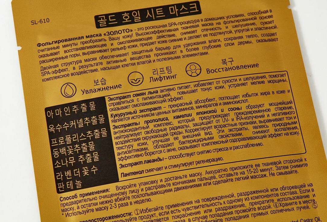 Фольгированная маска «золото» - это роскошная SPA-процедура в домашних условиях, способная в считанные минуты преобразить Вашу кожу!Высокоэффективная тканевая маска на фольгированной основе оказывает восстанавливающее и омолаживающее действие, снимает отечность и шелушение, сужает расширенные поры, выравнивает рельеф кожи, придает коже сияние и делает ее подтянутой, упругой и эластичной.Двойная структура маски обеспечивает защитный барьер для удержания влаги, сохраняя тепло, создает SPA-эффект, в результате активные вещества проникают в более глубокие слои кожи, оказывают комплексное воздействие, насыщая клетки влагой и полезными элементами.УвлажнениеЛифтингВосстановлениеЭкстракт семян льна активно питает, избавляет от сухости и шелушения, помогает справляться с пигментацией, повышает тонус кожи, устраняет мелкие морщины, оказывает омолаживающий эффект.Кукурузный экстракт – прекрасный абсорбент, поглощает избыток жира в коже и является источником ценных витаминов, минералов и аминокислот.Экстракт лаванды – способствует снятию стресса и расслаблению.Экстракты прополиса, камелии японской и сосны образуют мощнейший антиоксидантный комплекс, который предупреждает преждевременное старение, нейтрализует свободные радикалы, защищает от UV- и IRA-излучений и негативного воздействия окружающей среды.Корректирует возрастные признаки, выравнивает тон и текстуру кожи, улучшая ее внешний вид.Эти экстракты, являясь природными антисептиками, обладают бактерицидными свойствами, снимают воспаления, эффективно борются с акне, оказывают комплексный оздоравливающийэффект на кожу.Пантенол смягчает и стимулирует регенерацию.Способ применения:Вскройте упаковку и достаньте маску. Аккуратно приложите ее тканевой стороной к предварительно очищенному лицу и расправьте кончиками пальцев, оставьте на 15-20минут. Затем снимите маску, а остатки нежно вбейте похлопывающими движениями или сделайте легкий массаж. Не смывайте.* Используйте маску 2-3 раза в неделю.Меры предостороженности:①Избегайте применения на поврежденной, раздраженной илиобгоревшей на солнце коже.②Не используйте продукт, если есть чувствительность к одному изкомпонентов состава. Если в процессе применения на коже появляется покраснение илираздражение, прекратите использование и обратитесь к врачу.③Избегайте попадания в глаза, в случае попадания промойте водой.④Храните в месте, недоступном для детей, при температуре от 0 до 25С. Избегайте попадания прямых солнечных лучей.⑤Только для наружного применения. Не глотать!