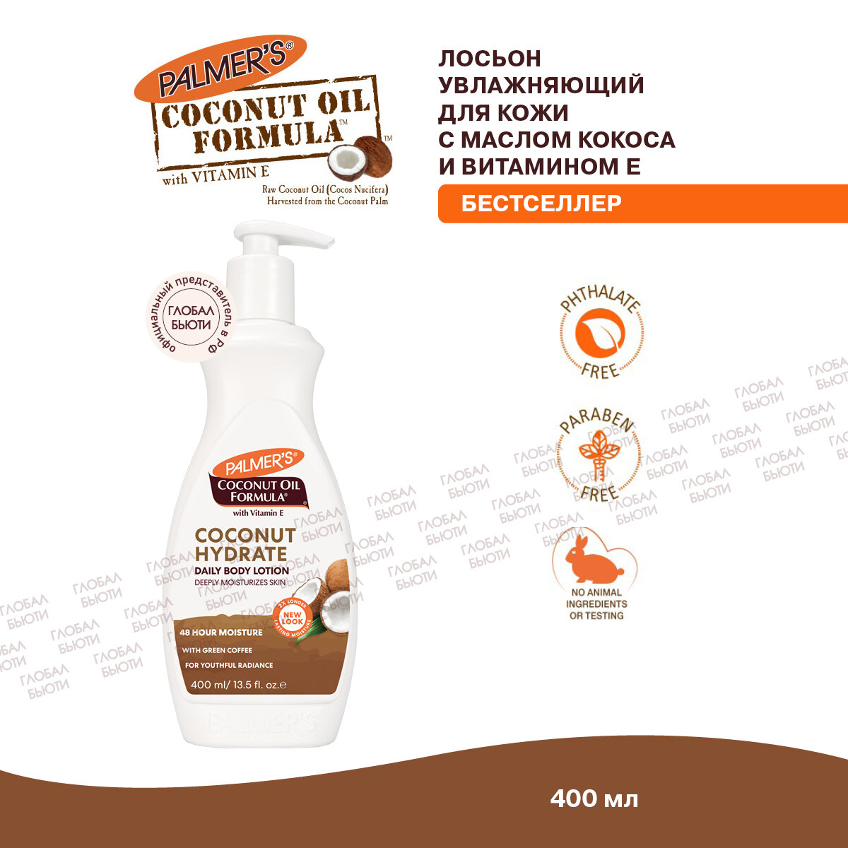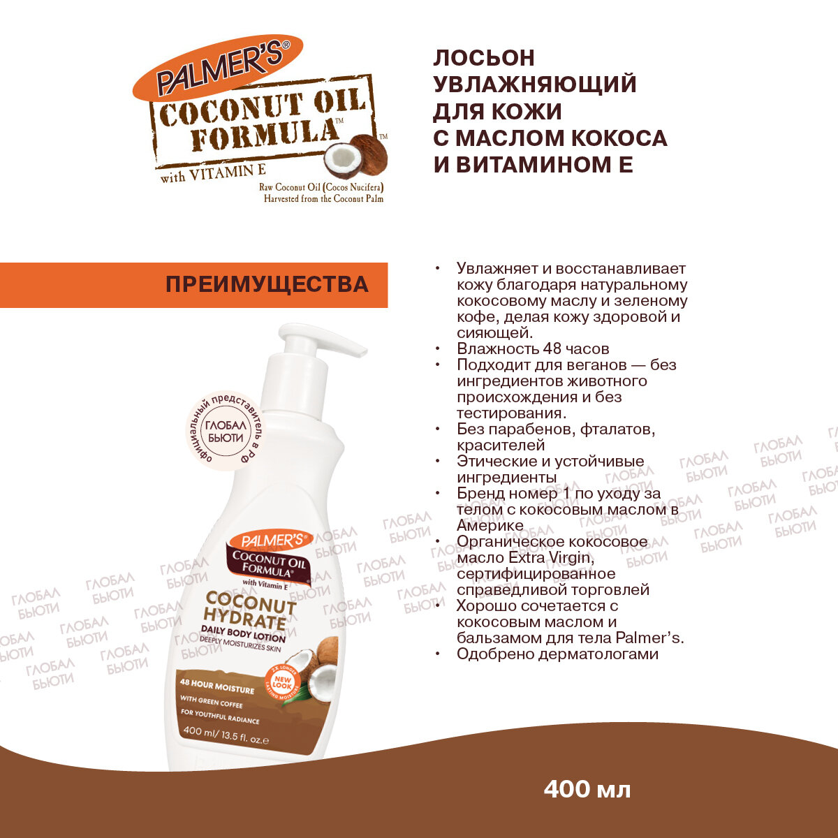 | Полное наименование | Лосьон Palmers для тела увлажняющий с маслом кокоса 400 мл |