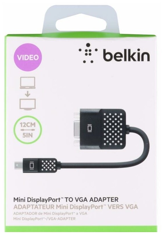 Переходник Belkin Adapter (F2CD028bt) позволяет подключать стандартный аналоговый монитор, проектор или жидкокристаллический (LCD) монитор, использующий порт VGA, к ноутбукам MacBook, MacBook Pro или MacBook Air, у которых есть разъем Mini DisplayPort. Благодаря данному переходнику вы можете использовать внешний монитор в качестве основного рабочего пространства, для расширения «рабочего стола» или в режиме видеоповтора, чтобы видеть всё, что видят ваши зрители.