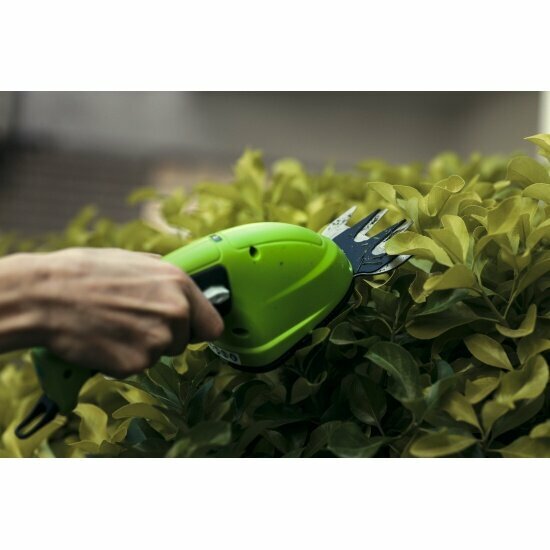 Ножницы садовые аккумуляторные с телескопической рукояткой Greenworks . Применяется для финальной обработки газона или кустарника. Для этого в этом комплекте электро ножниц предусмотрено 2 вида ножей: для травы 8 см и кустарника 16 см. Для удобства стрижки газона предусмотрена специальная штанга-удлинитель с колесиками у основания. Смена оснастки не требует инструмента. Вес самого инструмента составляет всего 700 грамм (без штанги удлинителя) - это одно из самых легких и компактных устройств такого рода.