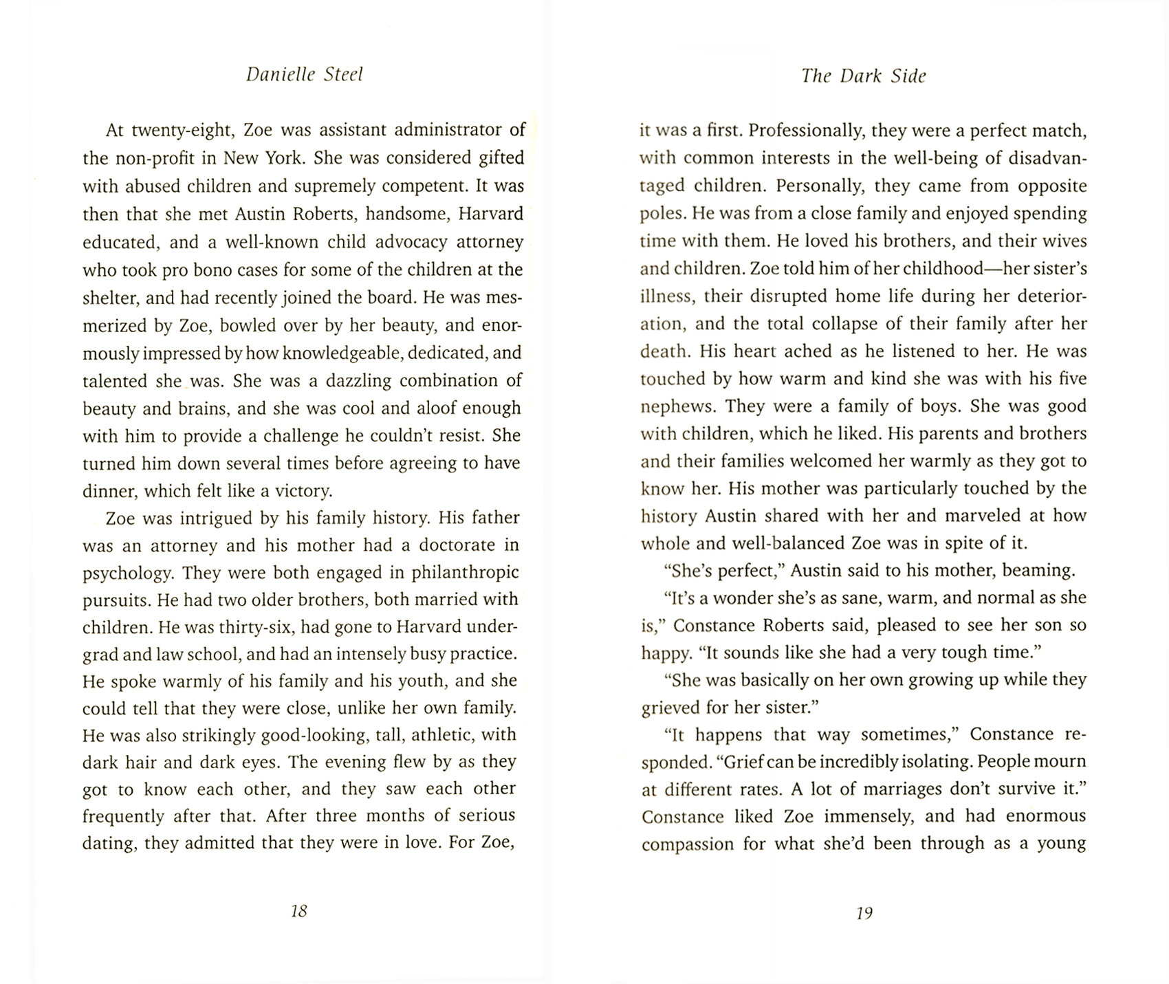 As a graduate of Yale, Zoe takes a leave of absence from medical school to work in a shelter for abused children in New York, where she meets well-known child advocacy attorney, Austin Roberts. Austin is bowled over by her beauty, brains and talent. He is her first love and the man she marries.