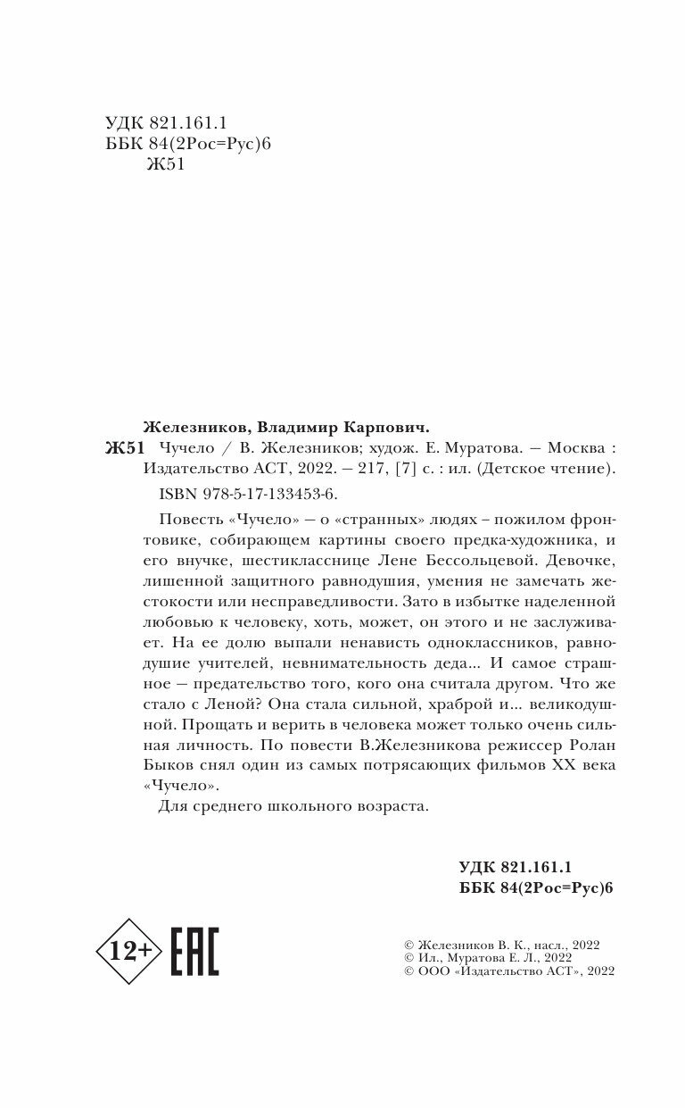 Повесть «Чучело» — о «странных» людях – пожилом фронтовике, собирающем картины своего предка-художника, и его внучке, шестикласснице Лене Бессольцевой. Девочке, лишенной защитного равнодушия, умения не замечать жестокости или несправедливости. Зато в избытке наделенной любовью к человеку, хоть, может, он этого и не заслуживает. На ее долю выпали ненависть одноклассников, равнодушие учителей, невнимательность деда… И самое страшное — предательство того, кого она считала другом. Что же стало с Леной? Она стала сильной, храброй и… великодушной. Прощать и верить в человека может только очень сильная личность. По повести В.Железникова режиссер Ролан Быков снял один из самых потрясающих фильмов ХХ века «Чучело».