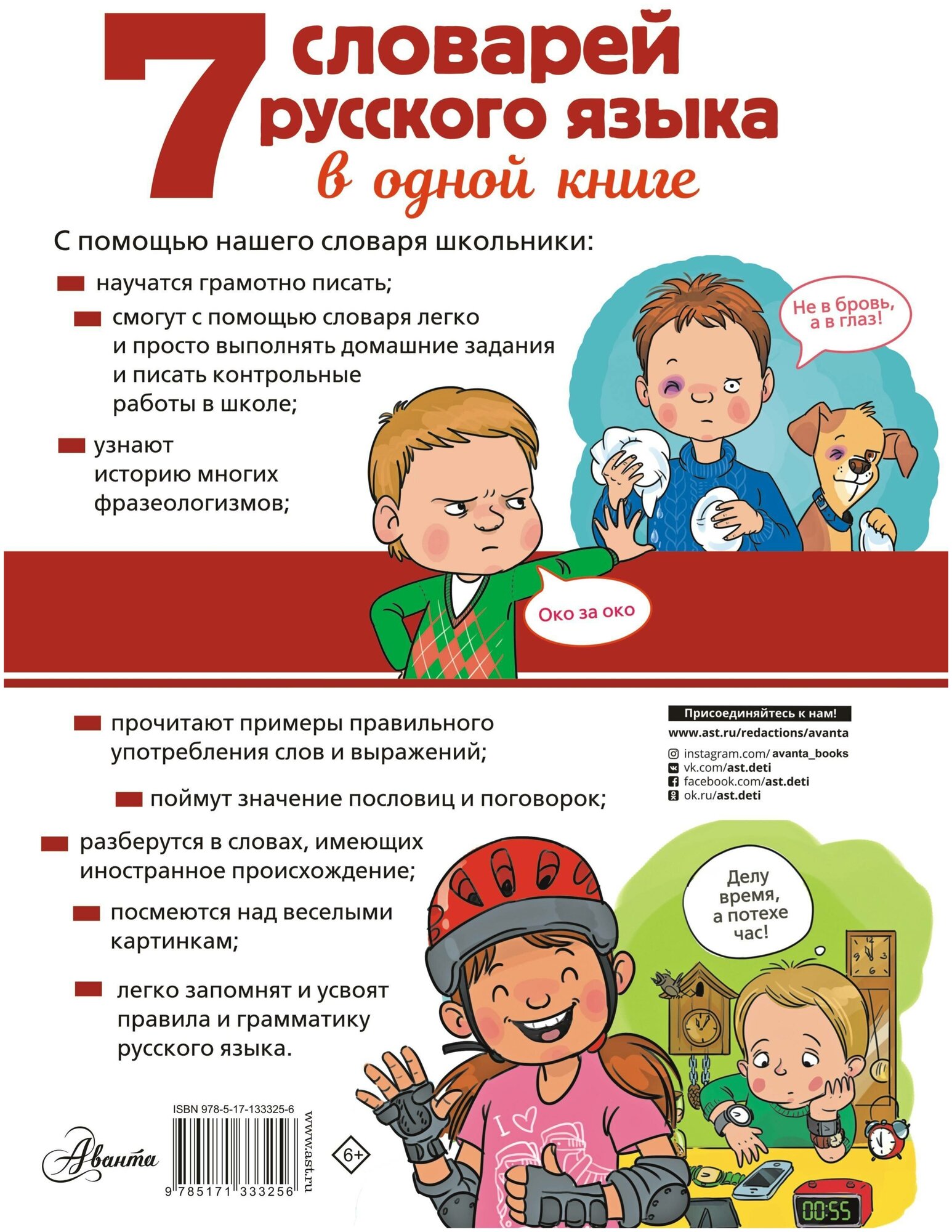 Словарь содержит 7 иллюстрированных словарей русского языка: орфографический, фразеологический, иностранных слов и другие. Книга станет для юных читателей незаменимым помощником и научит грамотно говорить и писать, обогатит их речь новыми словами и выражениями, заложит фундамент для успешной учебы в школе и вузе.