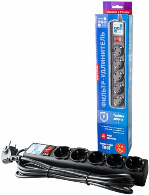 | Прочие особенности и свойства | Ток помехи, выдерживаемый ограничителем:не менее 2,5 кА Максимальная поглощаемая энергия:90 Дж Ослабление импульсных помех Защита от короткого замыкания Защита от превышения максимально допустимого тока 5 розеток с заземлением Материал корпуса |