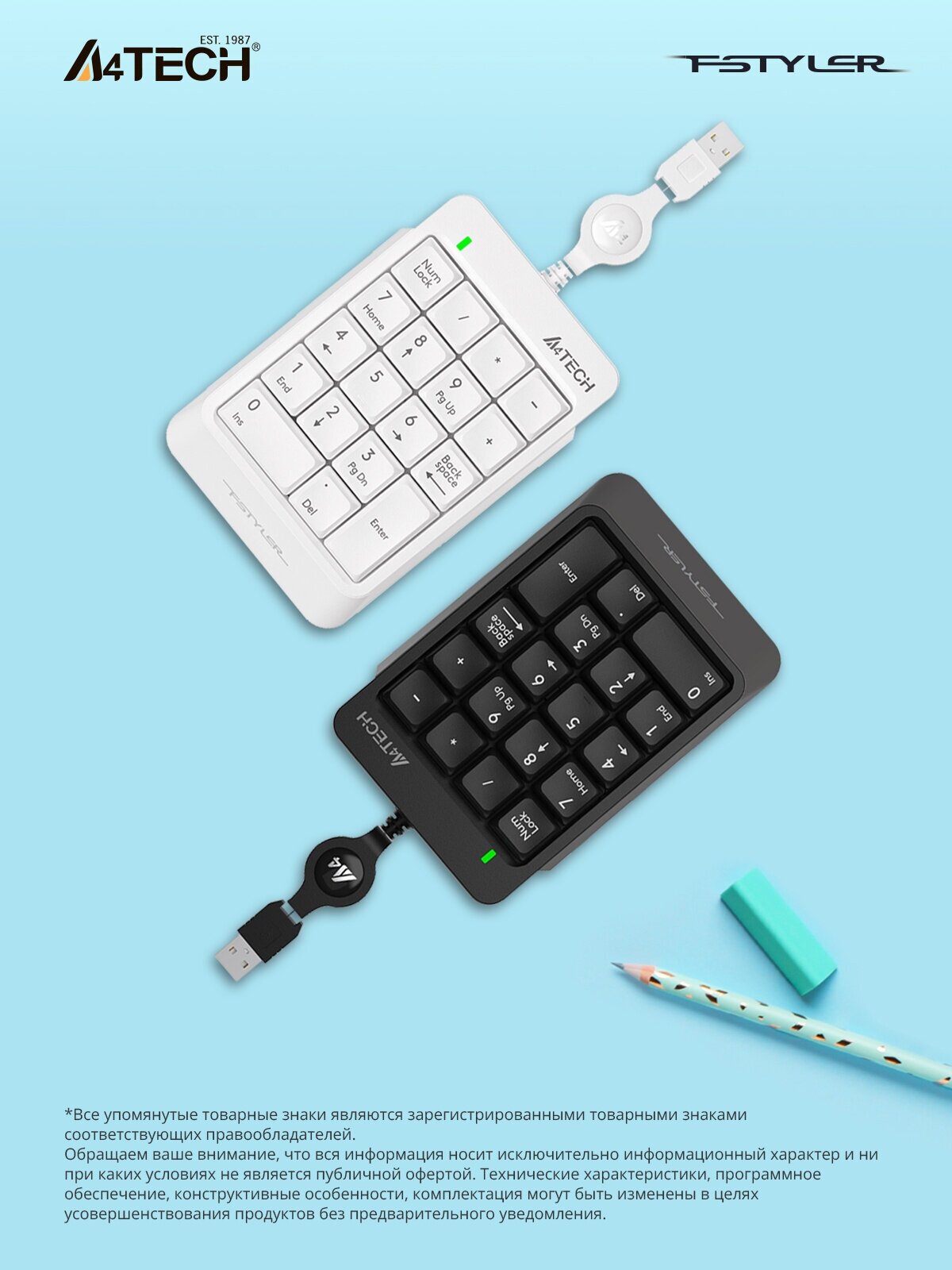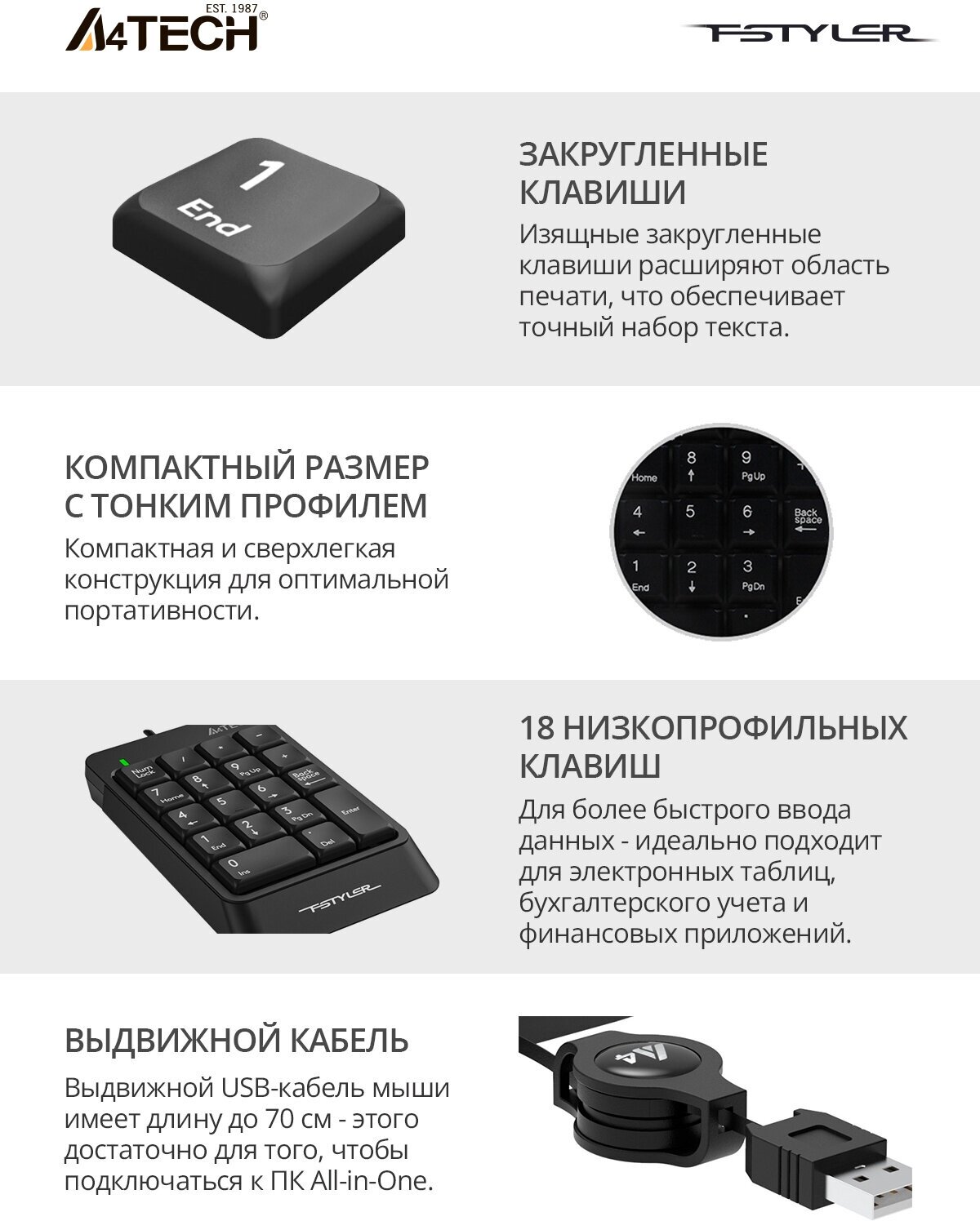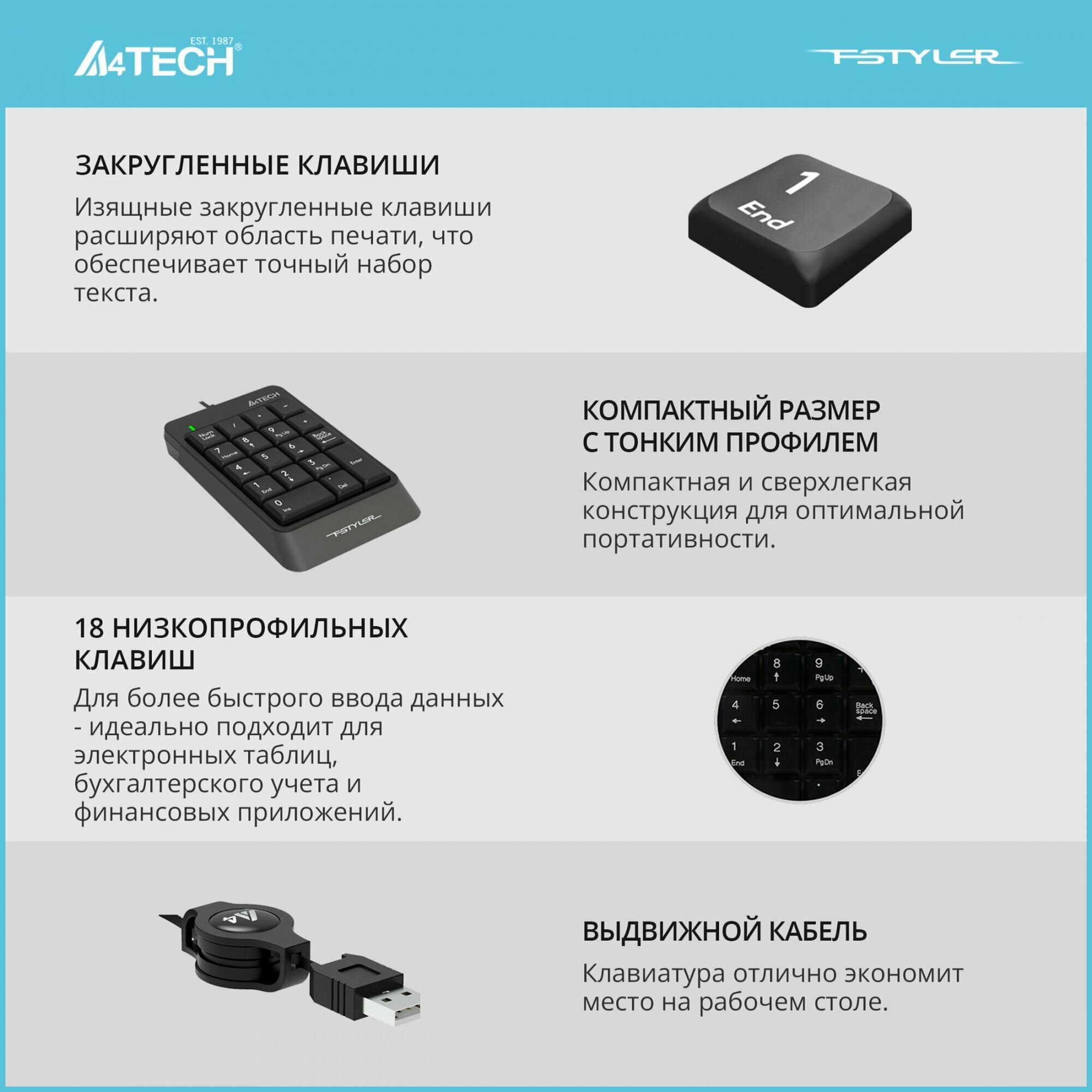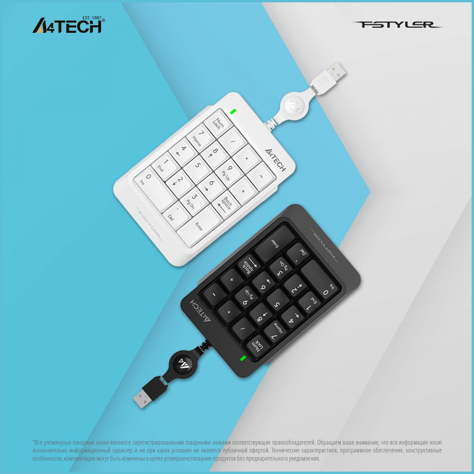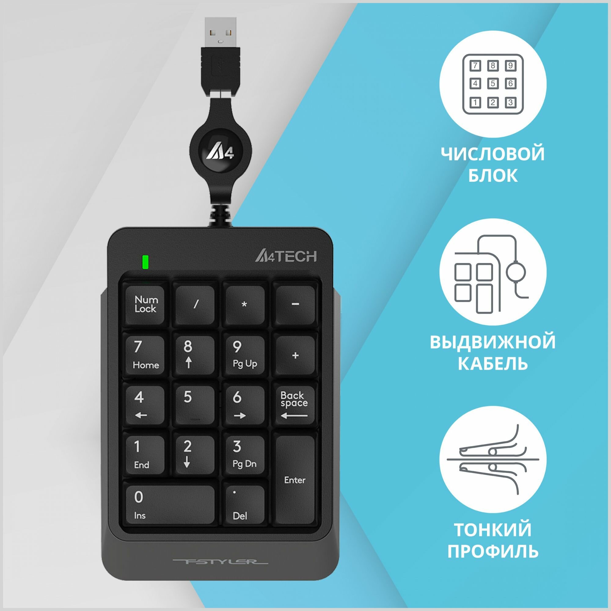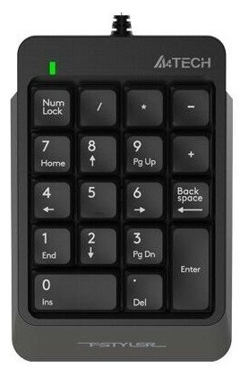 Числовой блок A4 Fstyler FK13 оснащен 18 квадратными клавишами, которые легко откликаются на прикосновение пальцев. Работает тихо, почти бесшумно. Клавиатура тонкая, имеет классическую форму и стандартную раскладку, она позволяет эффективно выполнять операции с цифровыми данными. Буквенные обозначения и цифры выполнены в белом цвете, хорошо видны. Использование русского алфавита не предусмотрено.