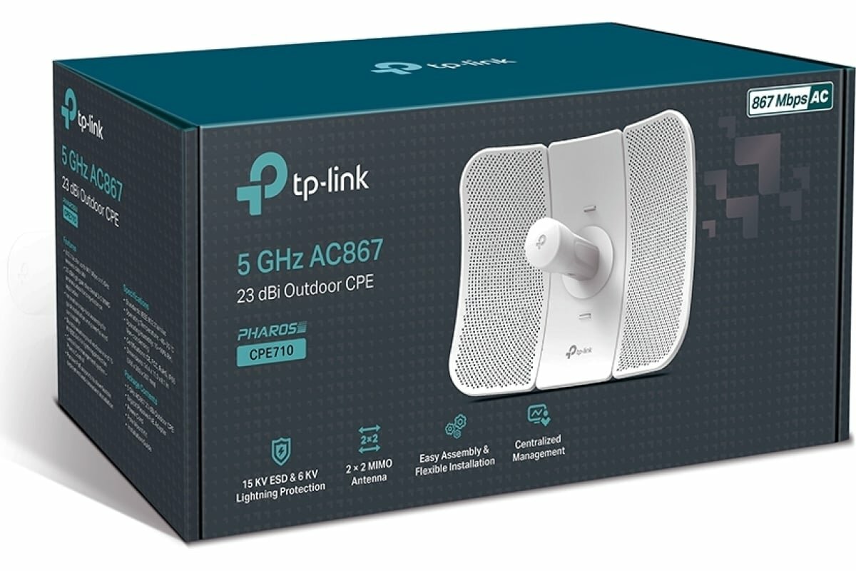 | Дополнительная информация | Скорость Wi-Fi 802.11ac до 867 Мбит/с на 5 ГГц,23 дБи направленная антенна высокого усиления 2?2 MIMO для передачи данных на дальние расстояния,Отличная направленность луча, меньше задержек и помех,Благодаря инновационным фиксирующим механизмам для быстрой сборки и прочной конструкции CPE710 устойчив даже при сильном ветре,Всепогодный корпус класса IP65, защита от электростатического разряда до 15 кВ и защита от удара молнии до 6 кВ обеспечивают работу в любых атмосферных условиях,Pharos Control — бесплатное приложение для централизованного управления сетью,Технология Passive PoE для удобной установки устройств |