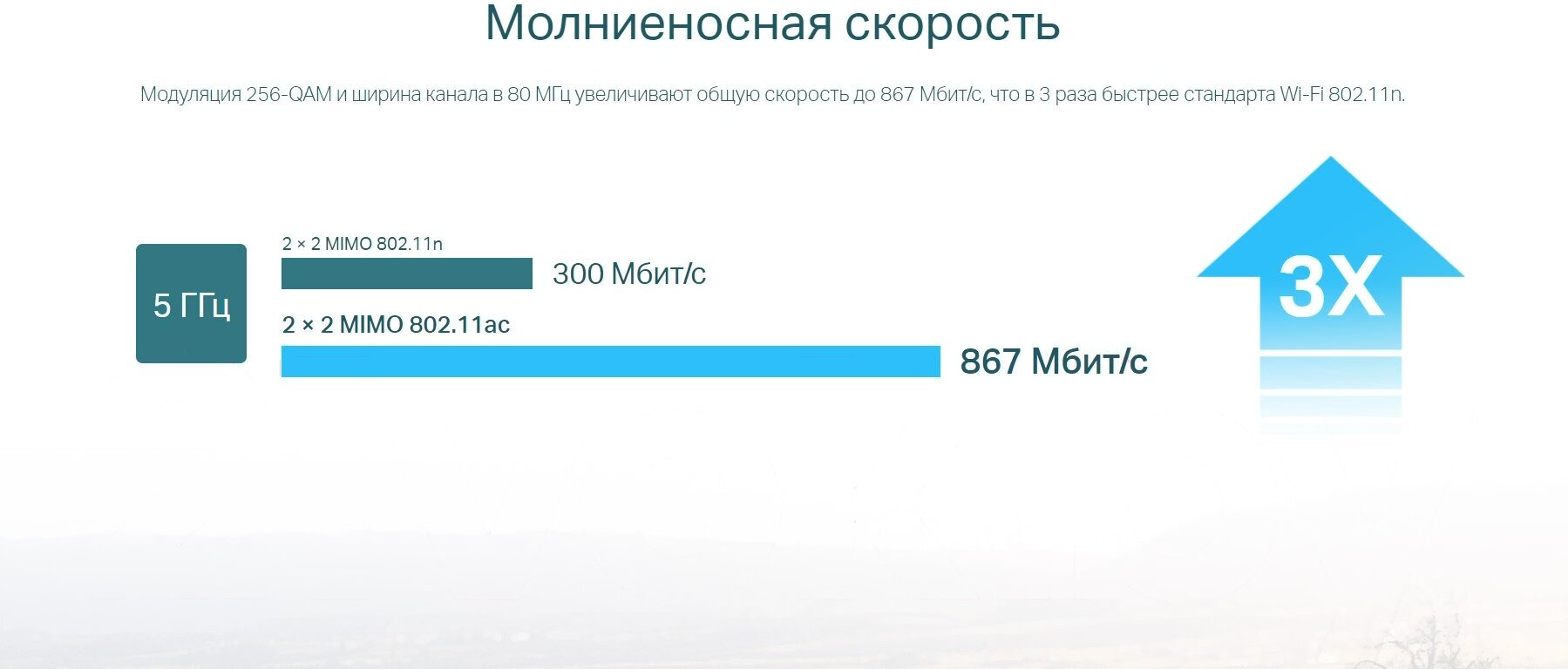 Модуляция 256-QAM и ширина канала в 80 МГц увеличивают общую скорость до 867 Мбит/с, что в 3 раза быстрее стандарта Wi-Fi 802.11n.