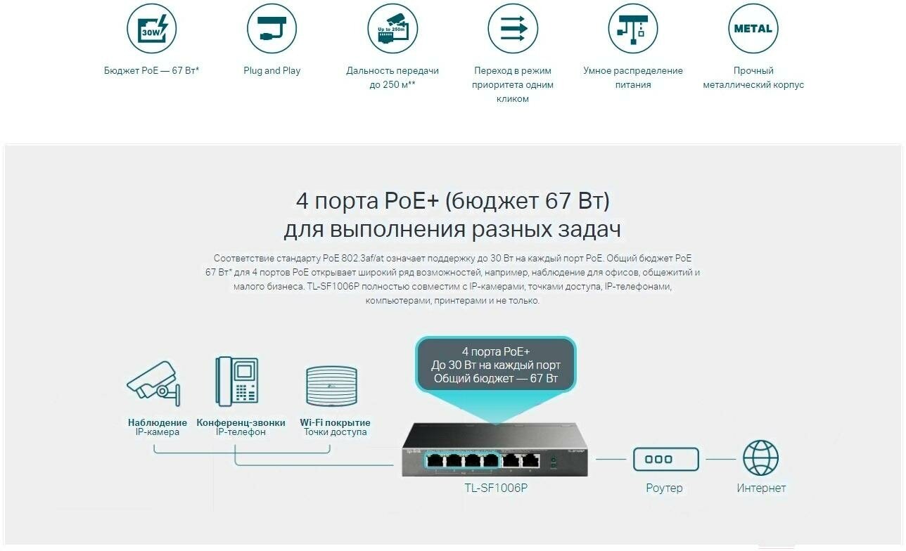 Высокомощный коммутатор с 4 портами PoE+, Plug and Play, дальность PoE для видеонаблюдения — до 250 м. Соответствие стандарту PoE 802.3af/at означает поддержку до 30 Вт на каждый порт PoE. Общий бюджет PoE 67 Вт* для 4 портов PoE открывает широкий ряд возможностей, например, наблюдение для офисов, общежитий и малого бизнеса. полностью совместим с IP-камерами, точками доступа, IP-телефонами, компьютерами, принтерами и не только. Качество выполнения важных задач, таких как видеонаблюдение за ключевыми бизнес-объектами, гарантируется благодаря возможности назначения высокого приоритета портам 1–2 в режиме приоритета, который включается одним нажатием.