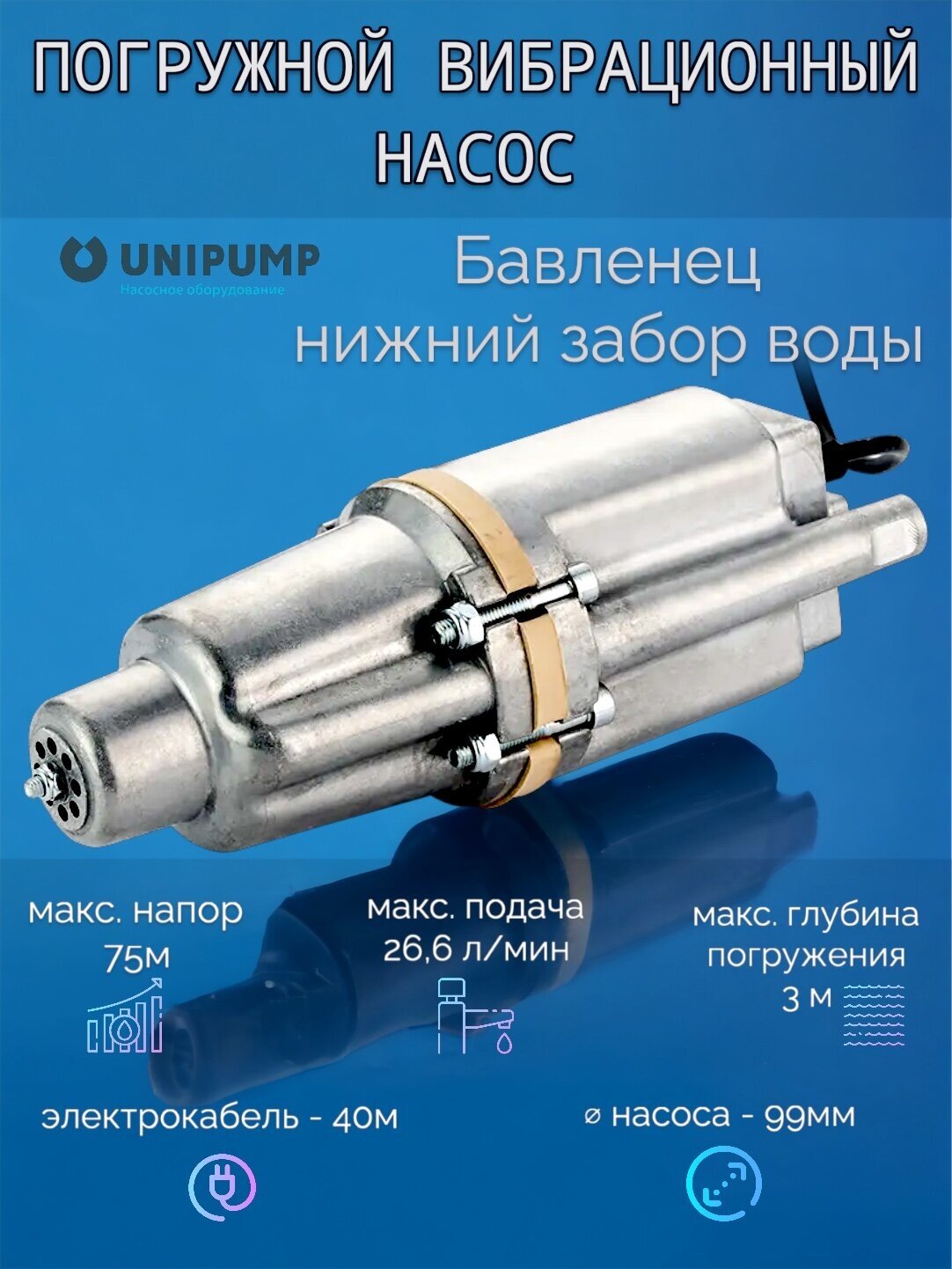 Вибрационный электронасос UNIPUMP БАВЛЕНЕЦ (забор воды - снизу, диаметр - 98 мм, макс. напор - 75 м, макс. производительность - 1600 л/ч, длина кабеля 40 м) для подъема воды из колодцев и скважин с условным проходом более 110 мм, а также для перекачки пресной воды из любых водоемов. Нижний забор воды. Длина кабеля - 40 м. Трос (нейлон) в комплекте.