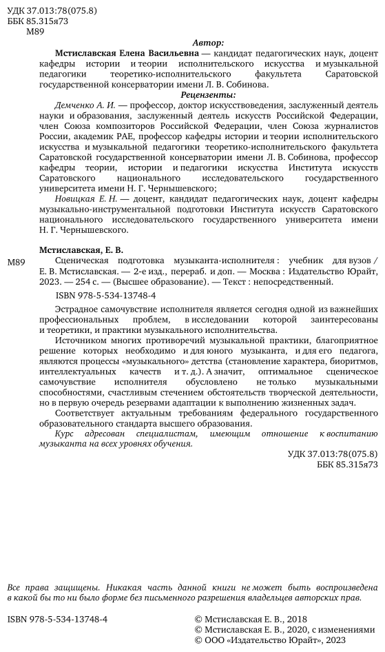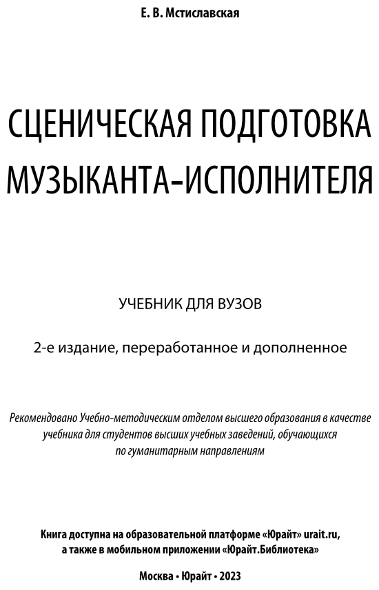 Сценическая подготовка музыканта-исполнителя 2-е изд. пер. и доп. Учебник для вузов (Елена Васильевна Мстиславская); ЮРАЙТ, 2020
