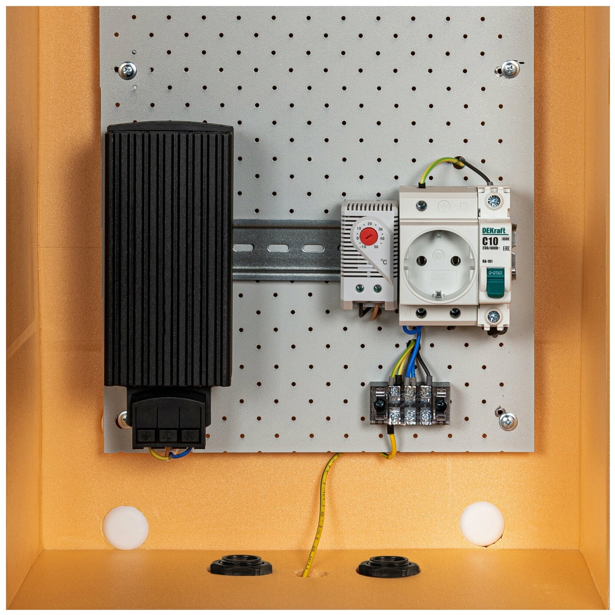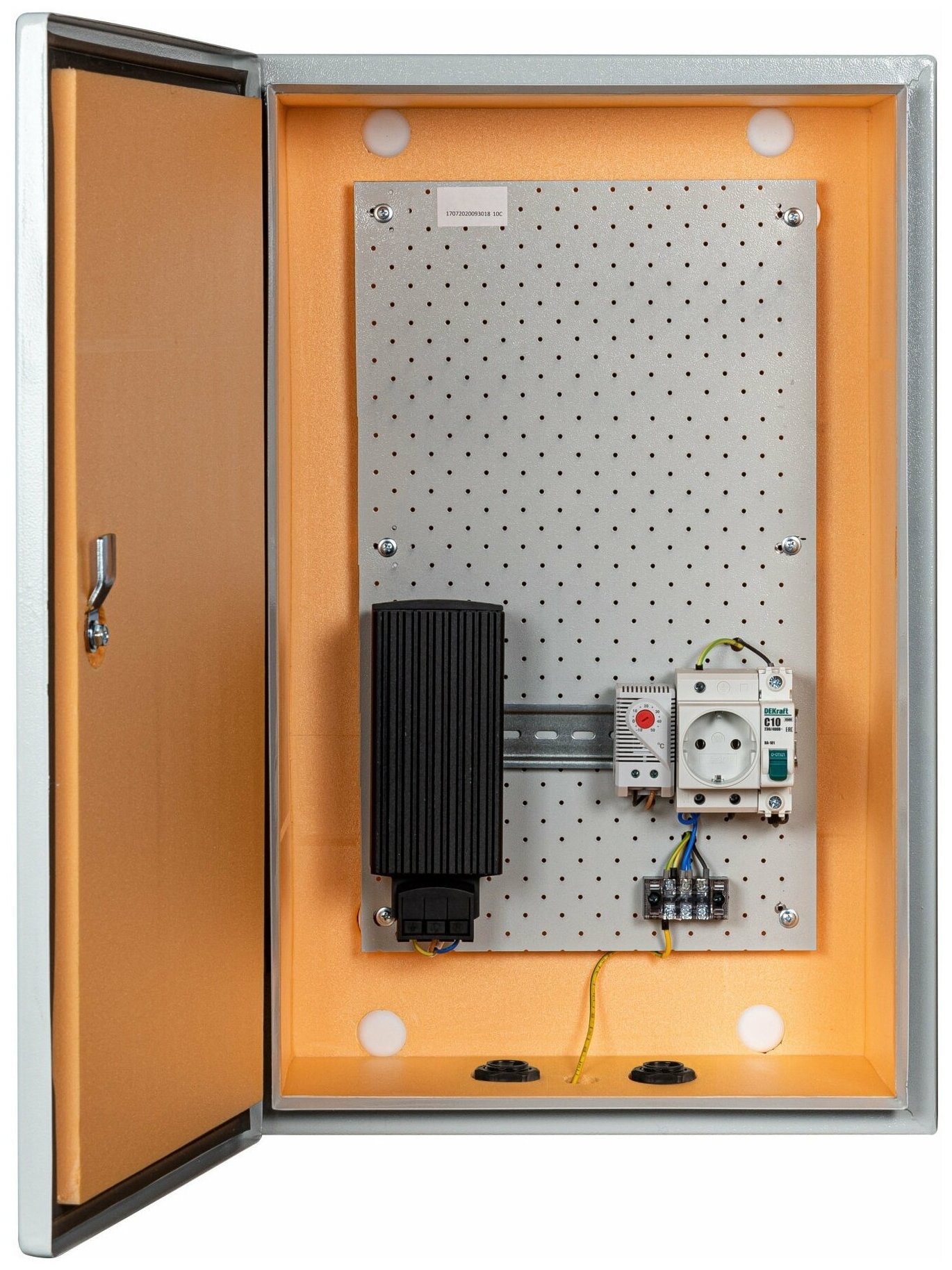 Термошкаф серии предназначен для монтажа электронного оборудования, требующего защиты от воздействия низких температур, пыли, влаги, атмосферных осадков, нежелательного доступа и других неблагоприятных факторов.Термошкаф оснащен системой автоматического поддержания заданной температуры и относительной влажности, обеспечивающей безопасную работу размещенного в нём оборудования при температуре окружающего воздуха от -50°С до +50°С со степенью защиты IP66.Комплектация: Утеплитель из пенополистирола толщиной 20 мм, замок, ключ, монтажная плата, гермовводы, розетка, автоматический выключатель, термореле, нагреватель мощностью в 75 Вт.