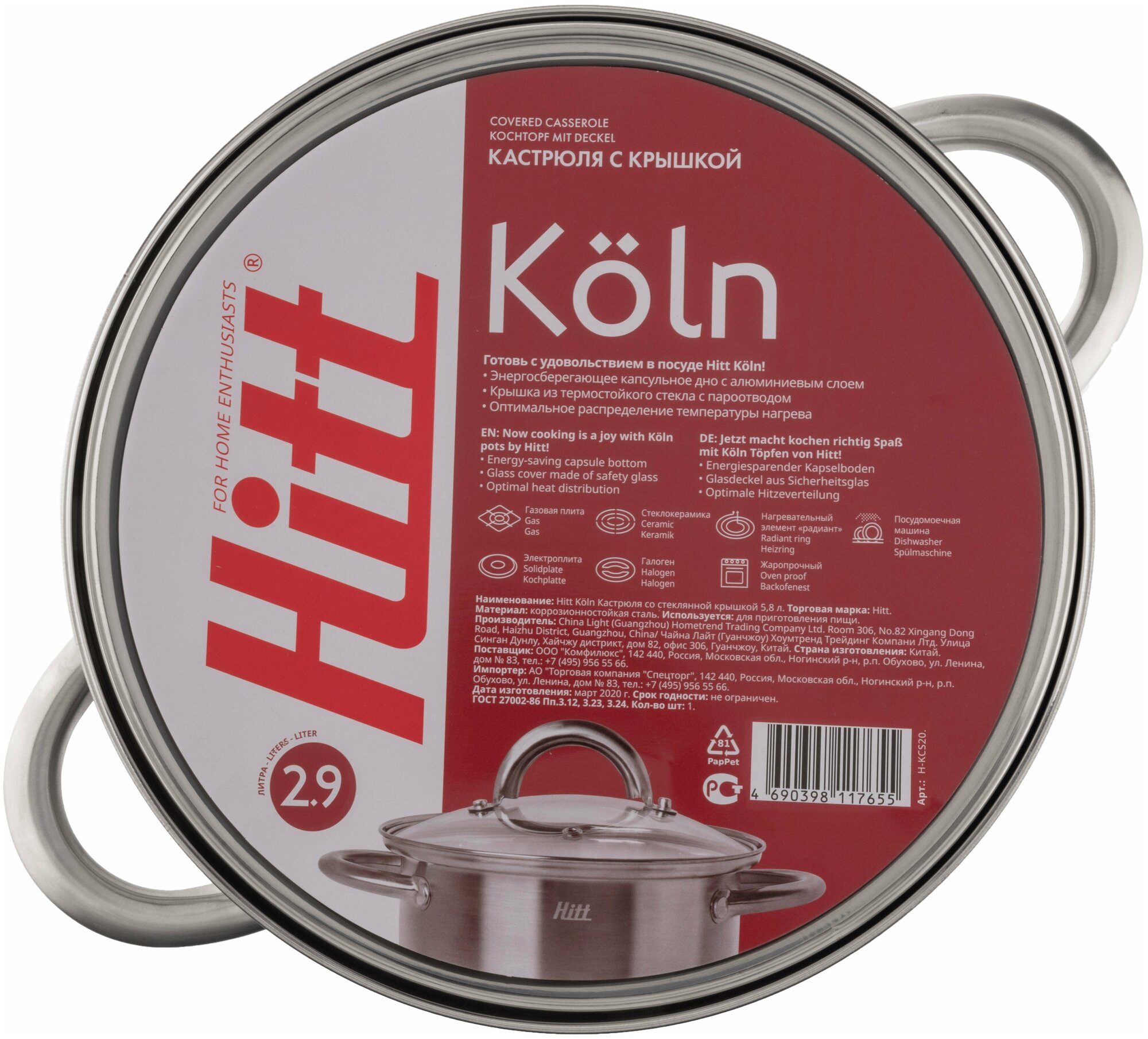 Кастрюля Hitt Köln 5,8 л 24х14 см со стеклянной крышкой. Изделие можно мыть в посудомоечной машине. Подходит для всех видов плит, кроме индукционных.