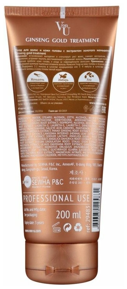 | Состав | Water, Stearyl Alcohol, Cetyl Alcohol, Behentrimonium Chloride, Cyclomethicone, Dimethicone, Amodimethicone, Zingiber Officinale (Ginger) Root Extract, Isopropyl Alcohol, Red Panax Ginseng Root Extract, Laureth-3, Laureth-5, Laureth-7, Malt Extract, Dimethiconol, Mentol, Parfum, Tromethamine, Salicyc Acid, Panthenol, Disodium EDTA, Laminaria Japonica Extract, Panax Ginseng Root Extract, Coffea Arabica (Coffee) Seed Extract, Lawsonia Inermis (Henna) Leaf Extract, Camellia Sinensis Leaf Extract, Sodium Lactate, Angelica Gigas Root Extract, Swertia Japonica Extract, Angelica Dahurica Root Extract, Vitex Trifolia Fruit Extract, Rheum Undulatum Root/ Stalk/ Stem Extract, Eclipta Prostrata Extract, Ulmus Davidiana Root Extract, Ganoderma Lucidum (Mushroom) Extract, Inonotus Obliquus (Mushroom) Extract, Thuja Orientalis Leaf Extract, Glycyrrhiza Glabra (Licorice) Root Extract, Isatis Tinctoria Root Extract, Magnesium Nitrate, Methylchloroisothiazolinone, Magnesium Chloride, Methylisothiazolinone |
