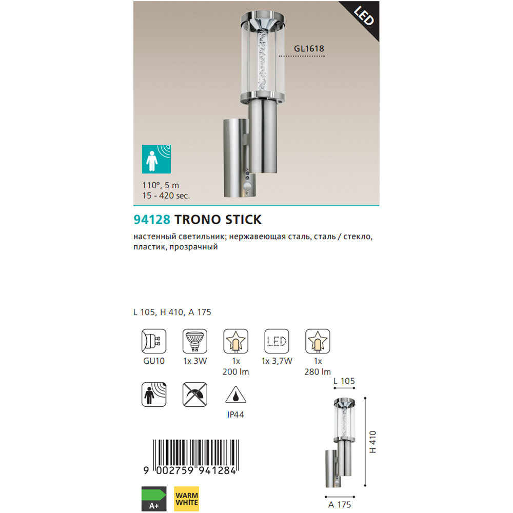 Настенный фонарь уличный с датчиком движения Trono Stick - продукт известной компании Eglo (Австрия). Имеет максимальную мощность 6.7 Вт, освещает площадь до 1 кв. м. Отлично подойдет для таких мест, как дача, фасад, веранда и беседка. Впишется в интерьеры следующих стилей: модерн, техно.