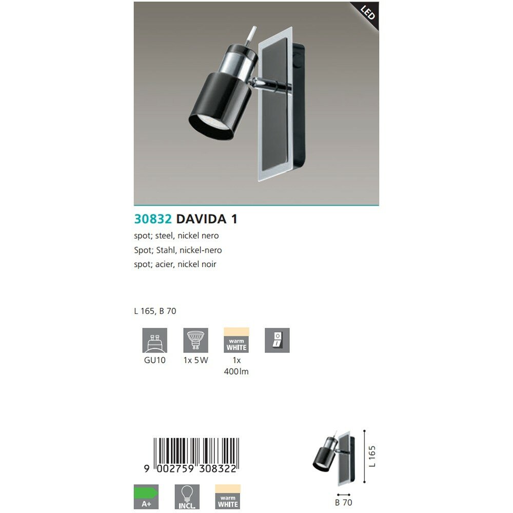 Спот Davida 1 - продукт известной компании Eglo (Австрия). Имеет максимальную мощность 5 Вт. Отлично подойдет для таких мест, как прихожая и коридор, спальня, гостиная, кабинет, офис, кафе. Впишется в интерьеры следующих стилей: техно.