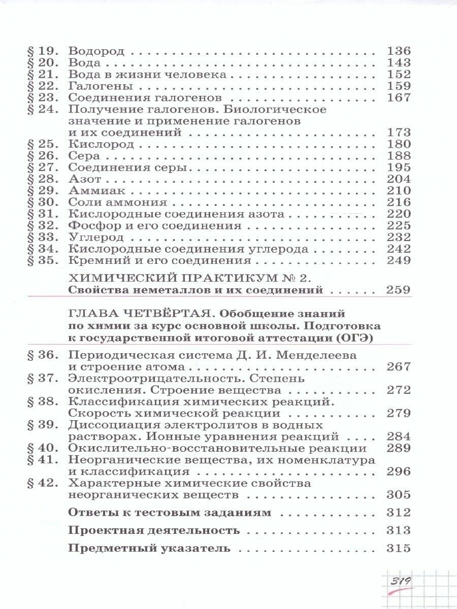 Учебник для изучения химии на базовом уровне. Подойдет для ознакомления с некоторыми металлами и неметаллами: совсем кратко описывается их строение и свойства их соединений. Написано понятно. Лабораторных довольно много; удобно, что они расположены прямо в тексте параграфа, а не вынесены отдельно. В учебнике большое количество рисунков и схем, а вот таблиц маловато. Шрифт крупный, компоновка текста хорошая.