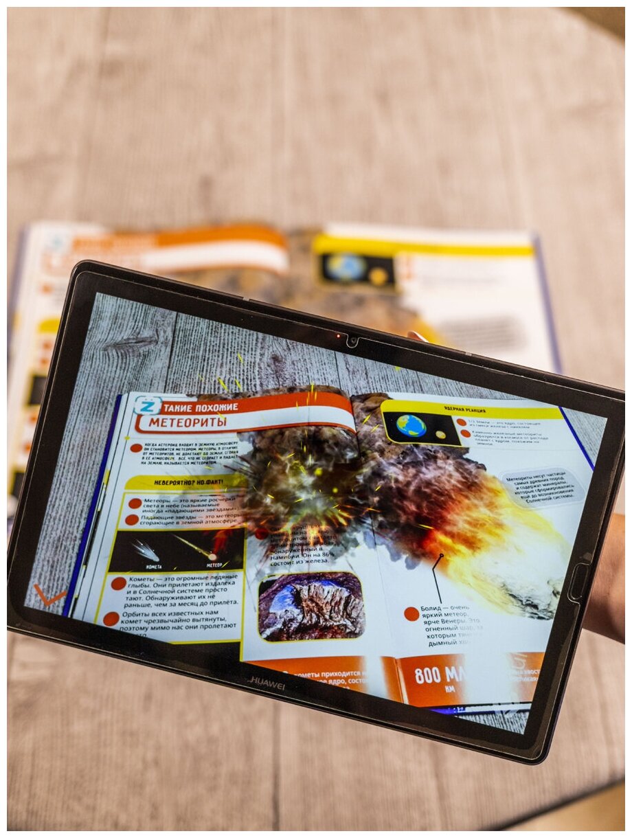 Кроме того, это необычная энциклопедия: каждого читателя ждёт сюрприз в дополненной реальности. Скачав бесплатное приложение, ты сможешь изучить планеты нашей солнечной системы (и даже заглянуть вглубь них), понаблюдать за запуском космического шаттла и увидеть метеоритный дождь! Почувствуй себя настоящим исследователем и узнай много невероятного!